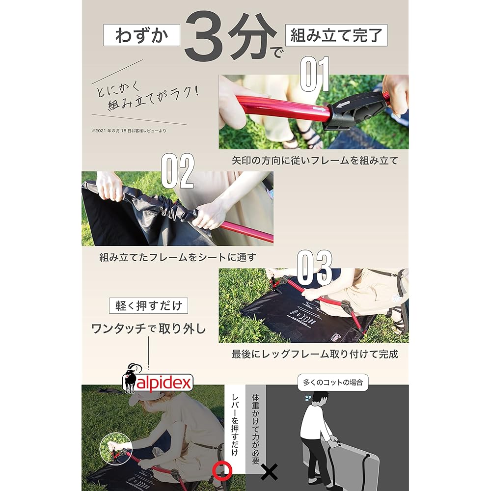 ✅ [Europe's No. 1 Low Cot from Germany] Unique 3D structure for ultimate sleeping comfort. Lowcot is the best-selling German trekking brand in Europe.・(Approx.) 190cm x 67cm ・World's lightest class and easy to carry ・Easy to assemble and clean up ・Storage bag with fixed hook ✅ [Limited time] Sales start campaign underway 🚫 [Please note] ALPIDEX's authorized domestic distributor is Only Natsea (Natural Stance Co., Ltd.) is available. Damage has been caused by Chinese retailers who do not ship products. Please make sure that the retailer is his Natusi. 🚫 . There is no need to put weight or force on it, so assembly and cleanup can be completed in just 3 minutes. ✅Easy to assemble, even for women. ✅ [Bed-like comfort] The unique structure provides just the right amount of elasticity and stability. The vertical size is also spacious (approximately) 190cm, so even tall people can sleep comfortably. The width is also spacious at 67cm, so you can sleep comfortably without your arms hitting the frame. ✅ [High Strength / Lightweight / Compact] Weight approx. 2 .1Kg. The world's lightest class. Made of lightweight and durable aluminum material (super duralumin A7075), which is also used in aircraft, it is lightweight yet high strength. ✅ [Stress-free storage] The dedicated storage bag is spacious and can be stored stress-free. ✅【Best Portability】Lightweight and easy to carry design. Adopts a fixed hook and can be fixed to a bike or backpack. It is also recommended for solo bike camping. ✅ [World's highest safety standards] ALPIDEX is also a member of the International Mountaineering Association UIAA (Olympic Committee of Mountaineering), which monitors international safety standards for mountain sports, and manufactures products based on high safety standards. . A camping bed (cot) that is lightweight, durable, and highly portable, created with high safety standards and advanced technology, for those who love mountain sports, from mountain climbers to outdoor enthusiasts. This cot is easy to handle even for beginners, making it a good entry model, and is also chosen by discerning mountain sports enthusiasts in Europe. ✅ [Passed Japanese domestic safety testing agency load-bearing test] Manufacturer's recommended load-bearing capacity is ``120kg'' Made of ``A7075 (super duralumin),'' which is particularly strong among aluminum materials. ✅ [Specification details] - Nylon specifications - Load capacity [120kg] - Wide and comfortable size - World's lightest class - Easy to carry storage bag included ✅ [Product size] - When used: Length (approx.) 190cm x Width (approx.) 67cm x height (approx.) 16cm, storage bag size/width (approx.) 57cm x width (approx. 16cm) x height (approx. 16cm) ✅ [Set contents] Bed sheet (cotton fabric) x 1 Leg frame x 3 Side frame ×2 Carry bag (storage bag) ×1