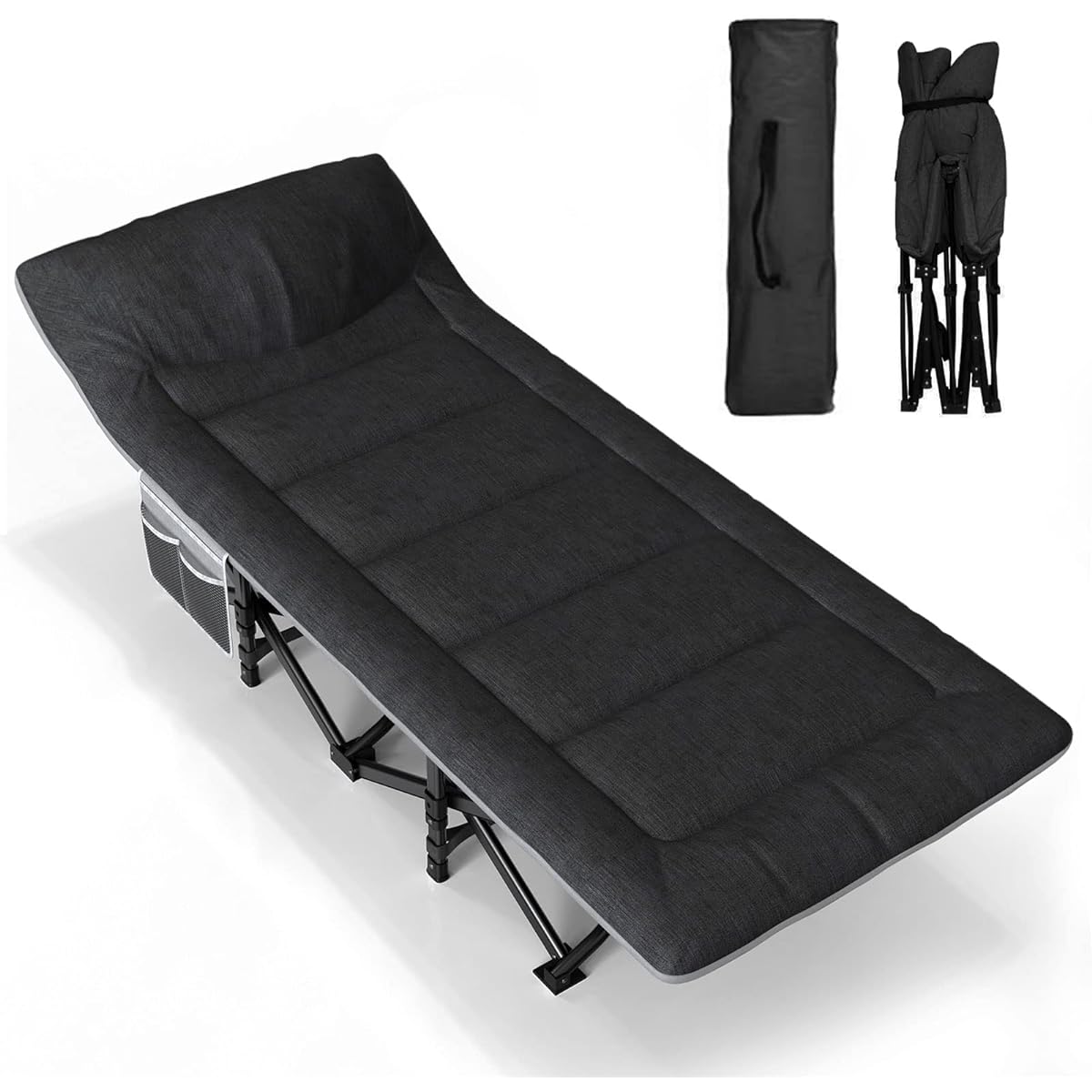 [Integrated design] The soft mattress that integrates the bed and camping bed provides a comfortable sleeping experience and solves your mattress problems. 【Soft Pillow】The camping bed comes with a pillow, the interior is filled with PP cotton, and the tilted head design brings you upgraded comfort. [Foldable and portable] No assembly required. This adult portable crib can be easily unfolded in less than 10 seconds or stored in your own pouch. Outdoors, camping, automobiles, travel, indoors, trekking, etc. [Three in one pocket] The large bedside pocket can store portable items such as cell phones and cups, which is very convenient. 【Durable Steel Frame】The night bed with heavy steel pipe and X-shaped structure supports up to 450 lbs weight to ensure safety and stability, perfect for adults and children.