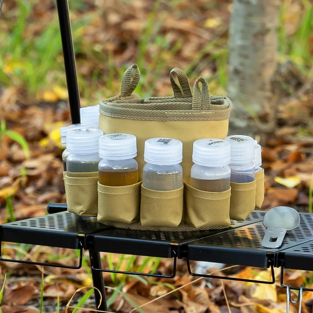 ●Seasoning case that allows you to carry seasonings for outdoor cooking such as camping ●Compact and portable with 10 large, medium and small bottle containers. ●Comes with a funnel that is convenient for transferring from one container to another, and a spice sticker to put on the bottle container ●You can hang it on a hook and set kitchen paper on it, so you can cook faster *Be sure to clean the bottle with a mild detergent before using it. Please wash before use. *Please do not use the dishwasher. *Please do not use the microwave.
