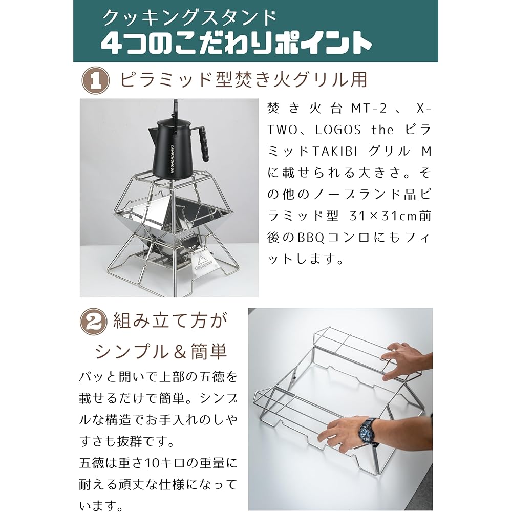 Total weight: approx. 1kg Size (when stored): approx. width 29.5cm x height 14.5cm x thickness 5cm Size (trive): approx. width 24.5cm x depth 20cm Size (when completed): approx. height 30cm x width 30cm × Height 14.5cm Material: Trivet/SUS304, Body material/SUS430 Application: Bonfire stand MT-2, burner, open fire placed on the ground Features: Made entirely of stainless steel, rust resistant and long life. All materials are made of stainless steel and are strong enough to allow you to cook simple meals on a wire rack! Assembly can be completed in about 5 seconds, no tools required, just a wide space! Stable cooking is also possible by placing it on a gas or liquid fuel burner that is 15 cm or less. A distance of 15 cm from the bottom allows you to add firewood or adjust the bonfire. There is no need to remove the net to add more firewood. Increase number of displayed items