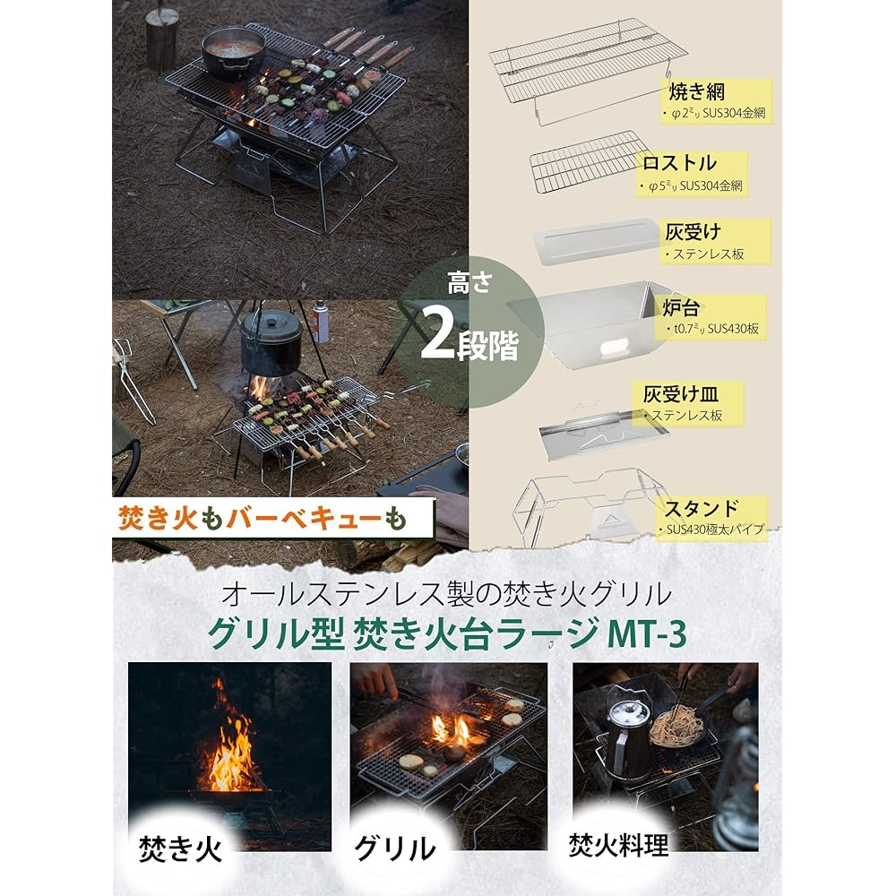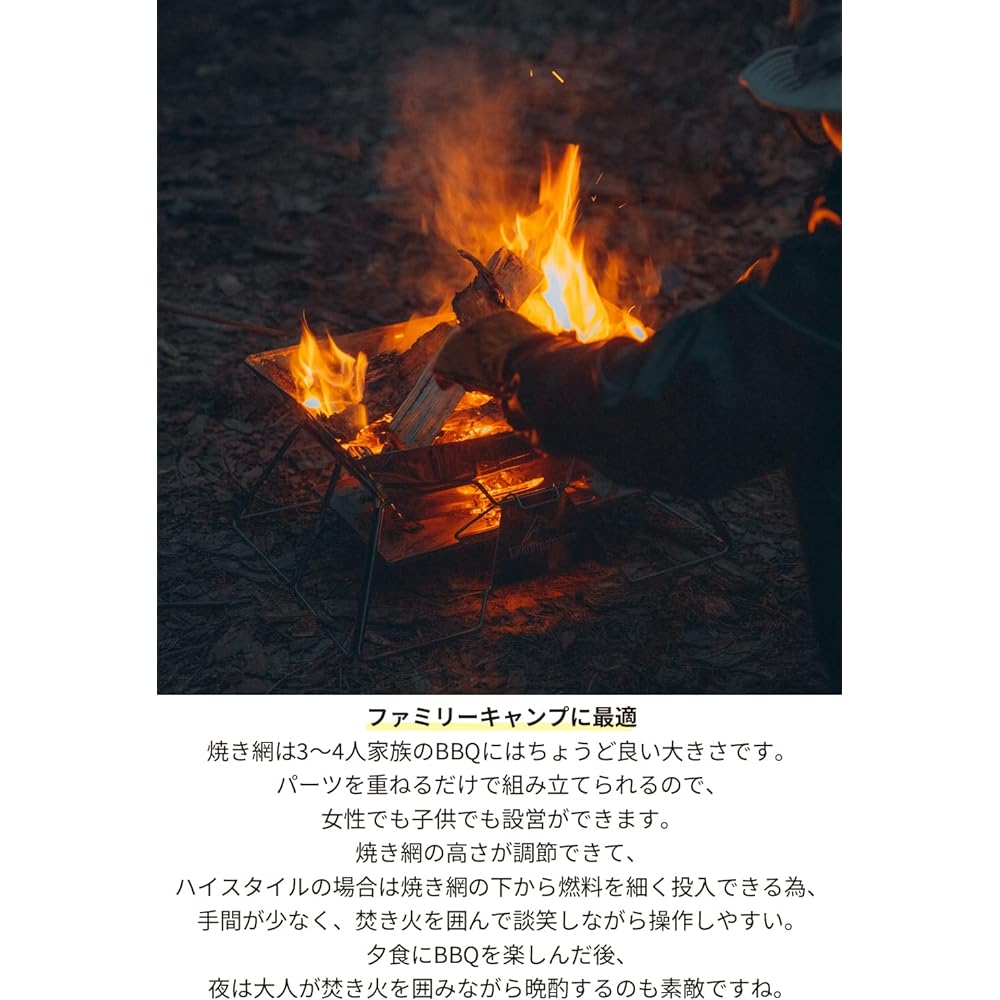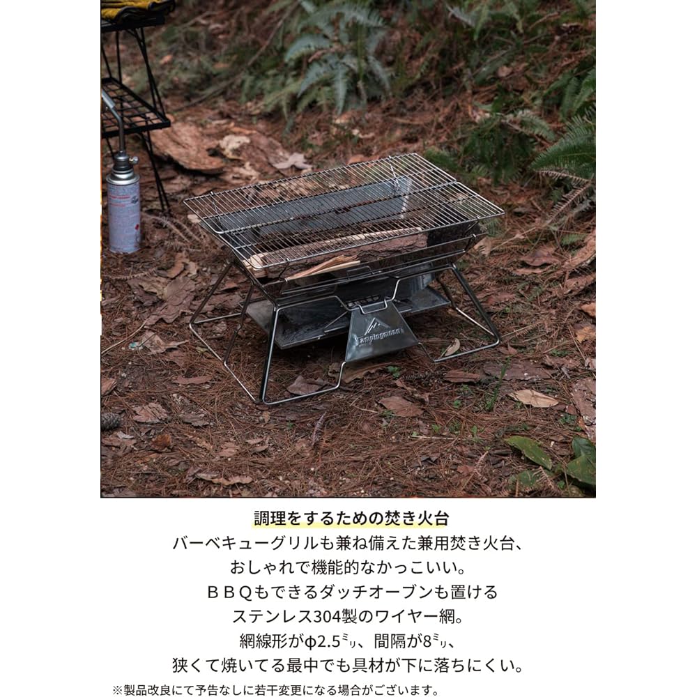 Total weight: approx. 4.3kg Size (when stored): Width 49cm x Height 17cm x Thickness 11.5cm Size (grid): Approx. Width 49cm x Depth 34cm Size (when completed): Height 26cm x Width 49cm x Height 34cm Material: Grilling net/SUS304, Main body material/SUS430, Storage case/Canvas Product contents: Main unit, roaster, grilling net, ash tray, ash tray, canvas case Applicable to: 3 to 5 people