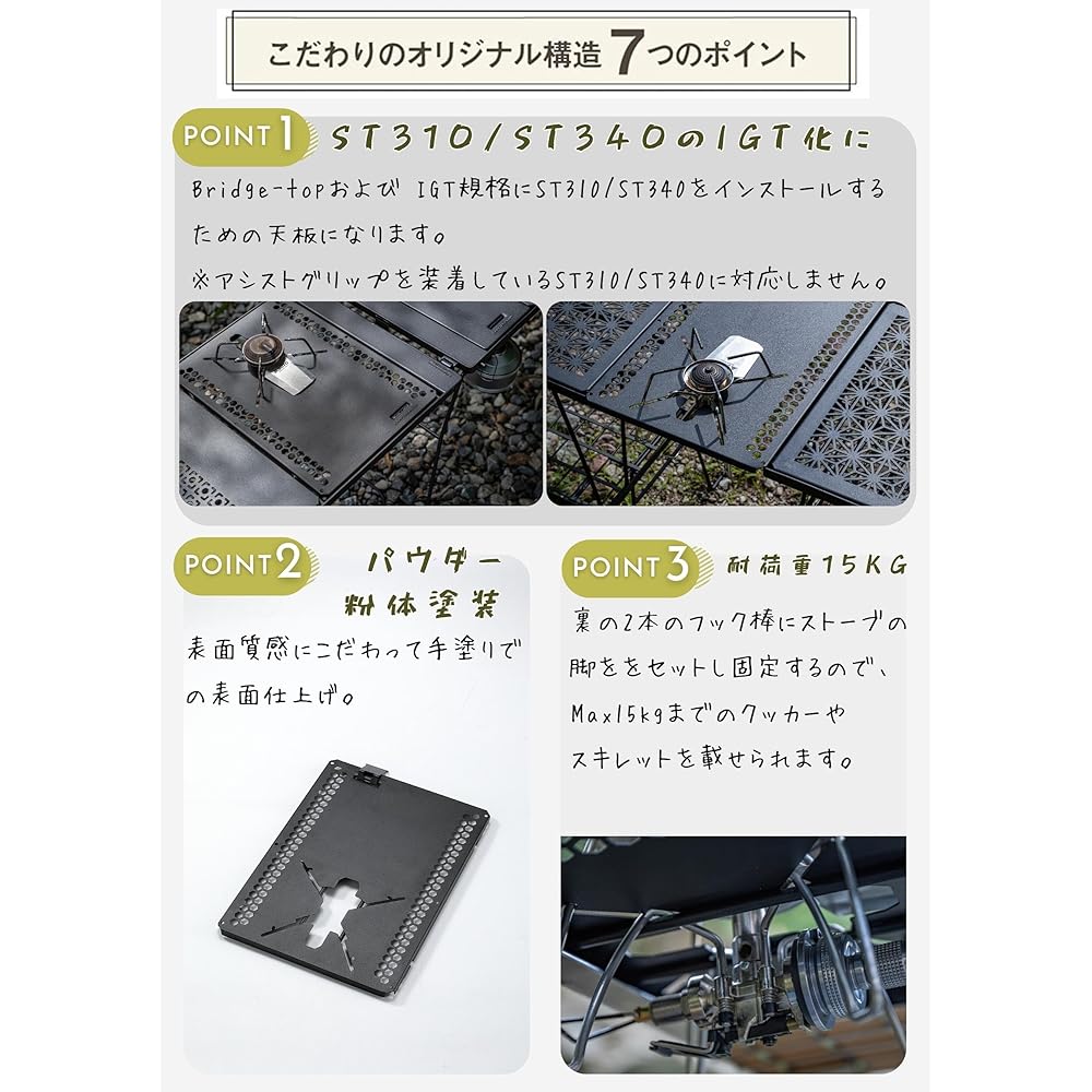 ST-top This is a top plate for installing ST310/ST340 on Bridge-top and Kitchen Stand. The amount is for 1 unit of IGT, so it can be used for other products as well. Compatible with ST310 / ST340 equipped with OMA.KNOB-No.071. *Please note that it is not compatible with ST310 / ST340 that are equipped with assist grips. To set up the stove, fit the legs into the grooves from the top, then set the CB can.A holder is included on the back to support the CB can, so you can hold it in the holder. Size: 250mm x 360mm x 13mm Material: Iron (powder baked coating) *As this is a painted product, it may peel or scratch if it is rubbed against a hard object. *Dimensions of IGT standard tables vary depending on the manufacturer, so please be sure to check the dimensions before purchasing. *Since the main valve of ST310/ST340 is installed below the top plate, operation is a little more difficult than usual. Please note that you may experience some inconvenience due to functional expansion. *There have been reports that the trivet of ST310/ST340 has deformed due to aging and cannot be placed horizontally on the top plate. Please make slight adjustments to the trivet before setting it.
