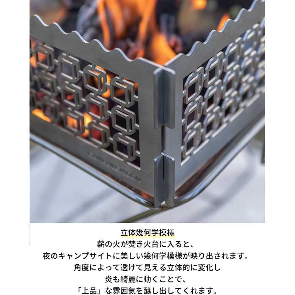 Material: SUS304 (plate thickness 2.0mm) Total weight: 1.6kg Size when used: External dimensions / Width 360mm x Depth 360mm x Height 115mm, Inner dimensions / Width 340mm x Depth 340mm Features: ① High precision craftsmen We use a laser processing machine to carefully cut out geometric patterns from 2.0mm thick stainless steel plates. When the wood fire enters the bonfire, the three-dimensional colors that are visible through the campsite at night are reflected, creating an atmosphere. ②It has a height of 11.5cm, and can be expected to have a windproof effect and prevent the spread of sparks. Purpose: Use in conjunction with bonfire stand MT-045.