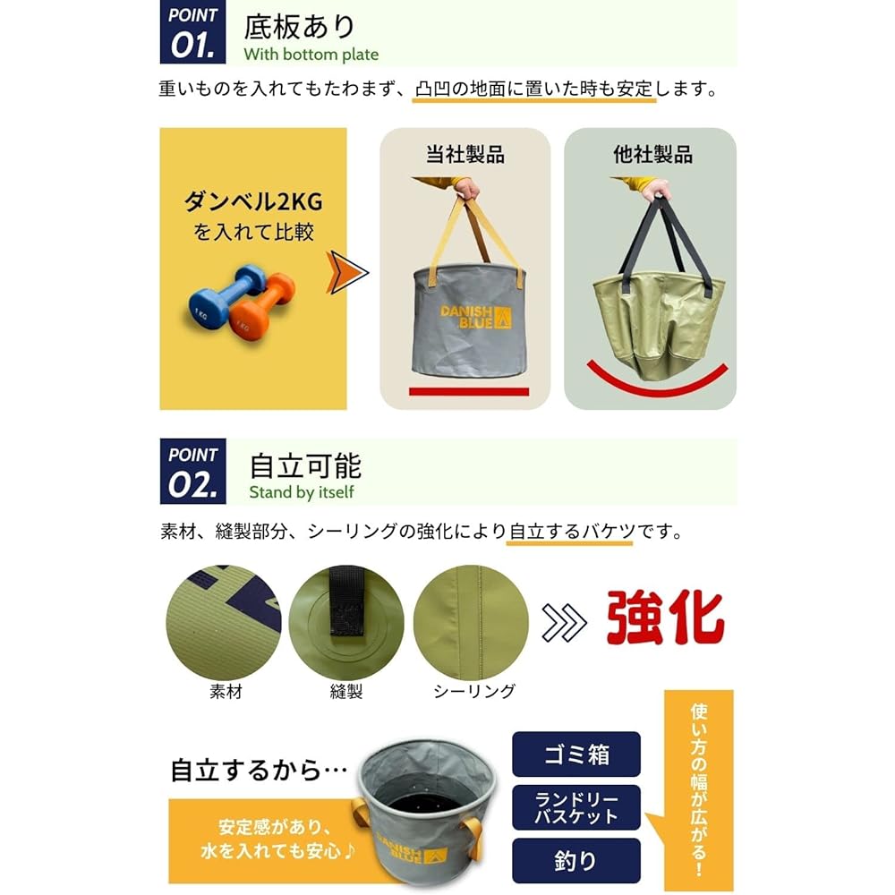DANISH BLUE® Folding Bucket with Bottom Plate and Clothesline Net, Made by Camp Instructor, Large Capacity, Freestanding, One-Handheld, Firewood Bag, Car Wash, Footbath, Fishing, Trash Can, Laundry