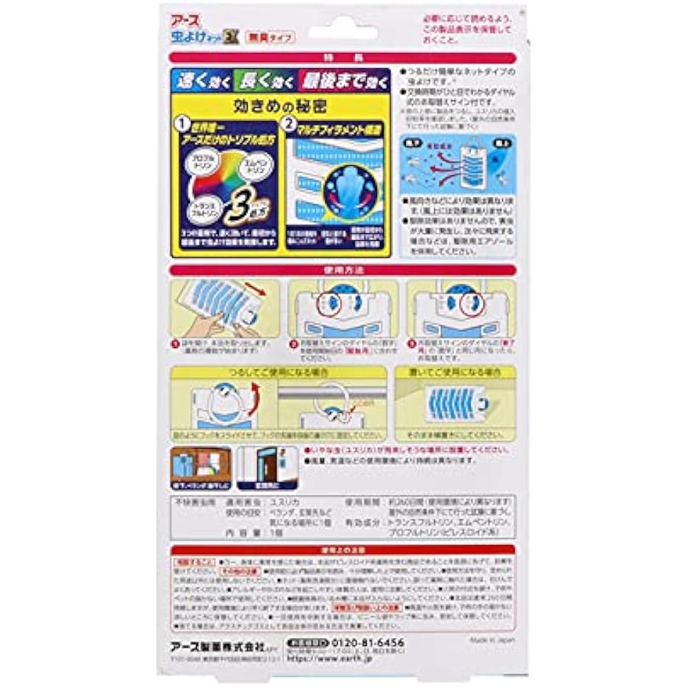 ●An easy-to-use net type insect repellent. *The product was hung above the window to check its effectiveness in suppressing chironomid invasion. (Based on tests conducted outdoors under natural conditions) [Secret of effectiveness that works quickly, works long, and lasts until the end] (1) Earth Pharmaceutical's exclusive triple formula: With three drugs (transfluthrin, empenthrin, profluthrin), Effective as an insect repellent from start to finish. (2) The net has a multifilament structure: Because the net is made of woven fibers one by one, there are many surfaces that come into contact with air, allowing the drug to spread from beginning to end and exhibit its effectiveness. ●Comes with a dial-type replacement sign that lets you know at a glance when it's time to replace it. ●It's okay even if it gets wet in the rain. ●Effects vary depending on wind direction, etc. (It is not effective upwind) ●There is no extermination effect, so if a large number of pests occur and they come flying one after another, please use an extermination aerosol together. [For unpleasant pests] [Active ingredients] Transfluthrin, empenthrin, profluthrin (pyrethroid) Precautions for use ●Keep the product label so that it can be read as needed. [Consultation] ●If you feel any abnormality in your body, please inform your doctor that this product contains a pyrethroid drug and seek medical treatment. [Other precautions] ●Be sure to read and fully understand the product label before use. ●Please follow the instructions and do not use it for any purpose other than the specified purpose. ●Do not touch the net (drug-impregnated part) directly. If you accidentally come into contact with the drug, wash thoroughly with soap. ●If you are prone to allergies or rashes, please use with caution. ●Avoid near fire and use out of reach of children and pets. ●Please do not let this product enter an aquarium containing ornamental fish, etc. ●This product usually lasts for 260 days, but it may end sooner depending on the usage environment. 380 g Japan