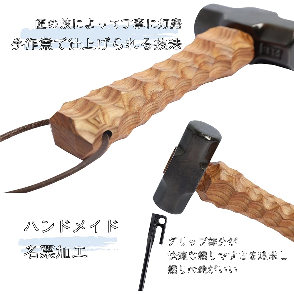 [It's heavy, but good! Hammer specializing in striking power] This hammer is purely specialized in striking, and also demonstrates excellent performance in peg driving. Since the weight of the head drives the peg, you can drive the peg effectively without worrying about the hardness of the ground. The weight of the hammer is 1kg, which is heavy, but this is good! [Naguri processing handle, comfortable grip] The handle of this hammer is processed with Naguri processing. This unique grip is designed for ease of grip and comfort, and is made using special processing technology to ensure that it is non-slip and fits securely in your hand. It does not put strain on your hands even when used for long periods of time and helps reduce fatigue. The easy-to-grip shape and anti-slip effect provide reliable operability and stability, supporting efficient peg driving work. [Hand-polished by craftsmen] This hammer has been carefully polished by craftsmen. This not only improves the quality and durability of the product, but also enhances the user's comfort and beauty. [Includes storage bag and cowhide strap] A leather strap is attached to the grip end. It is convenient in many ways because it can be hung or hooked. By wrapping the strap around your wrist, you can prevent the hammer from falling and increase your safety while working. It also comes with a storage bag. You can store pegs and hammers after use. [Product specifications] Product size: W10 x H23 x 4 (cm) Material: Iron, wood (genuine hickory) [About color and size] ◆We do our best to ensure that the product photos are as close to the actual color as possible, but depending on your monitor settings. The color of the actual product may differ depending on the lighting in the room, etc.
