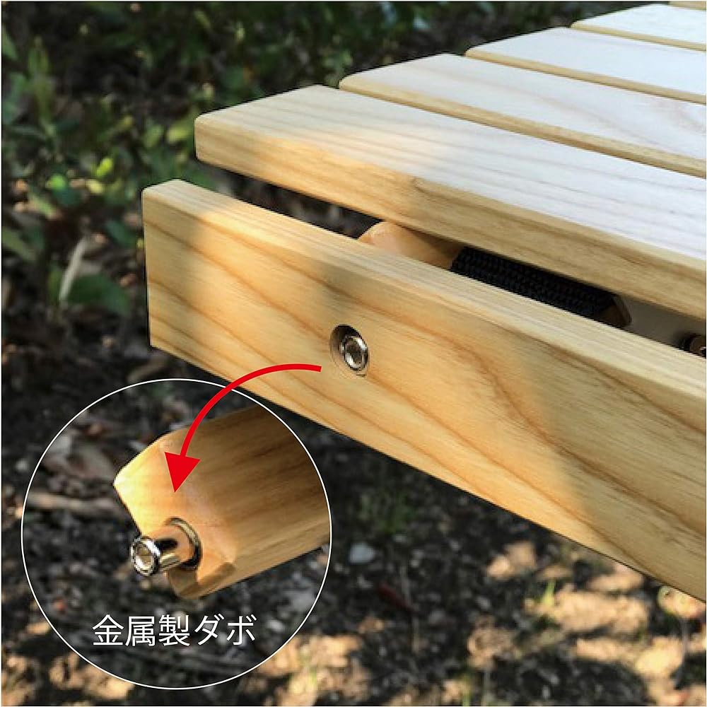 A wood table with a nice texture. The top plate can be rolled up and the legs folded for compact storage. A solid finish using white ash, a wood used for baseball bats. The top plate size is W1000 x D700mm, which is a size that allows four people to use it and still have space to place small items such as a lantern in the center. The height is H600mm, which is perfect for high chairs and cots.