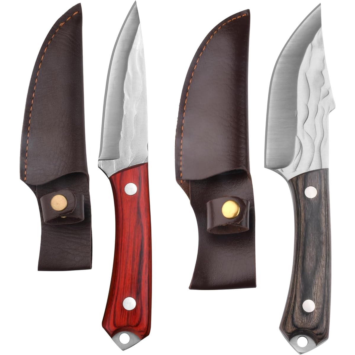 1✿Specifications: Total length: approx. 20.5cm Blade length: approx. 10.5/10cm Blade thickness: 4mm Blade width (max): 4/3cm Blade for both left and right hands Materials: Blade = High carbon stainless steel (5Cr15MoV), handle = Laminated reinforced wood (Pakka Wood) Body weight: 170/145g 2✿ (Multi-purpose outdoor knife) The small size makes it easy to hold, and the sharp edge is useful for a wide range of purposes such as cutting tree branches, fencer sticks, and cutting ropes. Suitable for a variety of occasions such as camping, mountain climbing, hunting, fishing, barbecue, and cooking. It is easy to operate in small turning operations, and is also useful for peeling fruits, dividing into small pieces, cutting meat, etc. 3✿(Sharp sharpness cooking knife) Using high carbon stainless steel material, high temperature quenching and repeated forging process increases the density and hardness of the steel material, making it highly abrasion resistant. The 15-18 degree cutting process improves sharpness and durability. The 4mm back thickness provides sturdiness and weight, making it suitable for cutting frozen meat with survival knives and cooking knives. 4✿ (Easy to hold kitchen knife) The processed handle that fits well in your hand is made of laminated reinforced wood (packer wood) used for military supplies, and is highly water resistant and corrosion resistant. The full tang structure further increases the sturdiness of the unit, making it safe to use as an outdoor survival knife. 5✿(Conveniently portable sheath knife) Comes with a sheath that can be hung on your waist belt, making it more convenient and safe for outdoor use. Carrying this product with you without justifiable reason is prohibited by law. Please do not purchase if you are under 18 years of age.