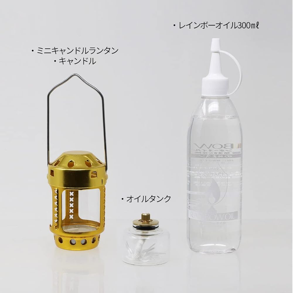 Set contents: Mini candle lantern, candle, oil tank, rainbow oil 300ml, 1 adjustment screw each Burning time: 5ml per hour (when standard flame length is 20mm) *About 4 hours when the oil tank is full Size: Mini candle lantern/ Approximately width 55 x height 90mm Materials: Mini candle lantern/aluminum, oil tank/glass (core: fiberglass), rainbow oil/paraffin hydrocarbon Usage: For creating an outdoor atmosphere or for disaster prevention.
