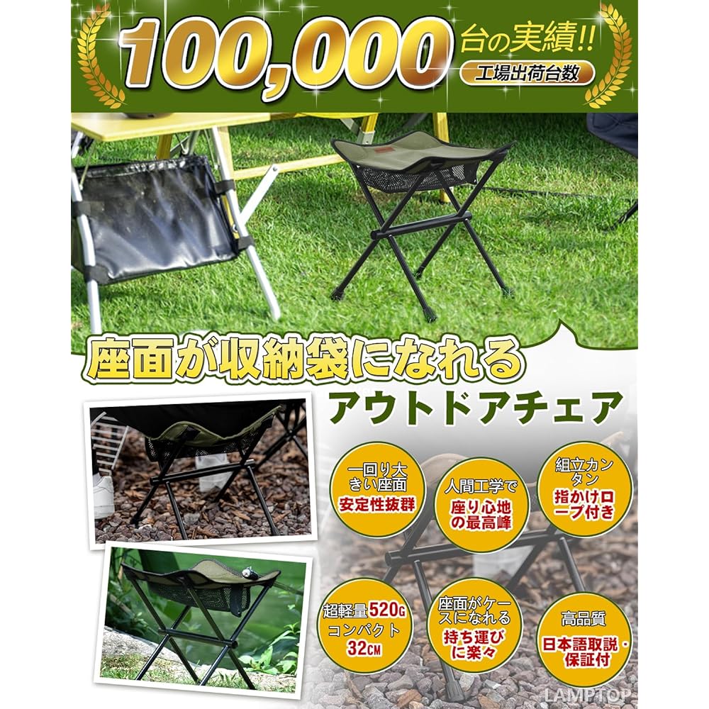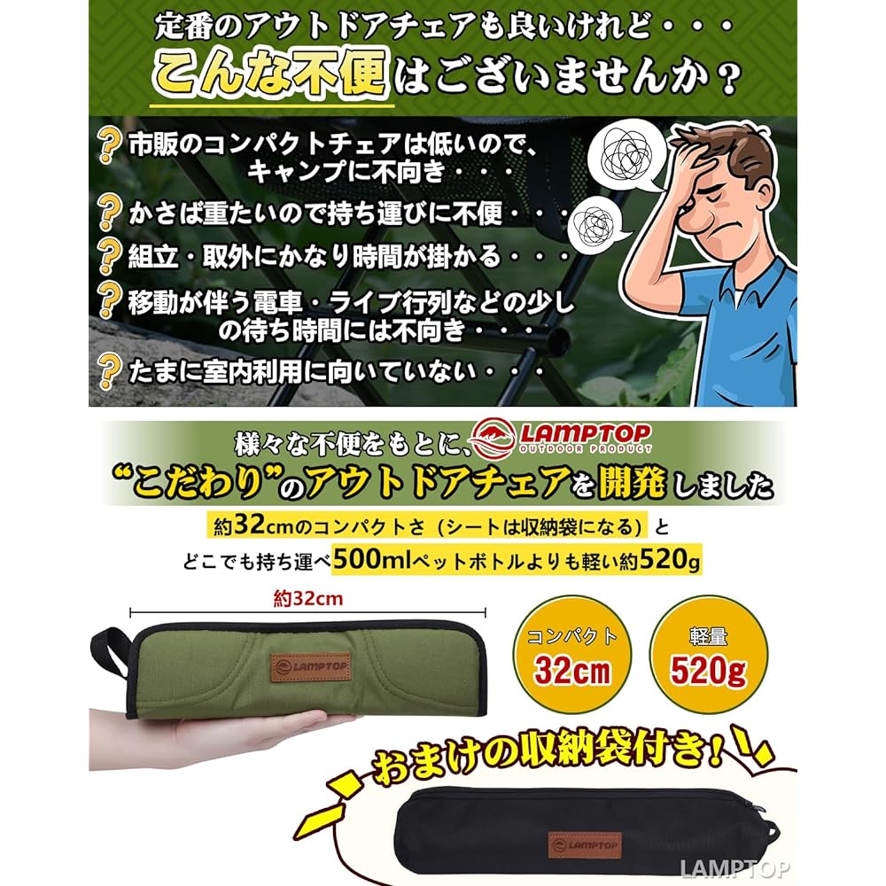 LAMPTOP outdoor chair, compact chair, height 34cm, ultra-lightweight 520g [Japanese instruction manual included] Folding chair, camping chair, fishing, cherry blossom viewing, queuing, storage bag included (green), set of 2