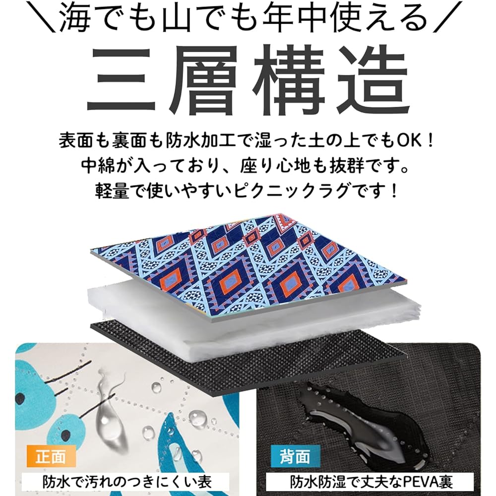 [Three-layer structure for outstanding seating comfort] Both the front and back sides are waterproof, so you can use it even on wet soil! It is padded and extremely comfortable to sit on. A lightweight and easy-to-use picnic rug! [Suitable for various occasions] Can be used as a beach mat for picnics, camping, outdoor activities, children's spaces, fireworks displays, sports days, cherry blossom viewing, and swimming at the beach. [Stylish pattern that looks great in photos] The most distinctive feature is the stylish pattern♪ It's sure to stand out at picnics and swimming at the beach♪ Just take a stylish photo with it! [Lightweight and compact when folded] Leisure mat that is easy to fold and carry! Comes with Velcro and handle. [Stain-resistant surface] Waterproof and dirt-resistant surface makes it easy to clean!
