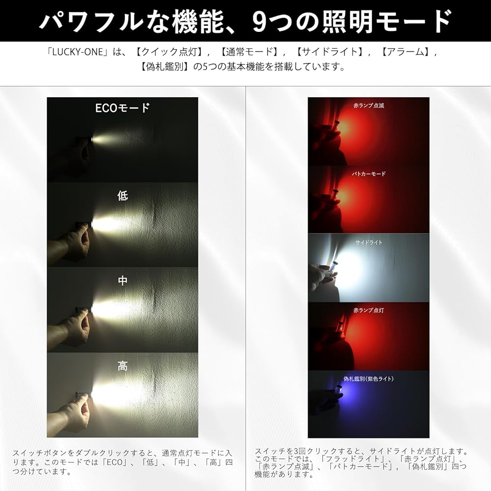 ⚡ [Ultra compact and high brightness] "LUCKY ONE" is an extremely small and high brightness flashlight weighing only 20g. Double-click the switch button to enter normal lighting mode. ⚡ [IP65 waterproof and dustproof specification & excellent durability] With IP65 waterproof performance, it can withstand everyday rain and snow, and can be used even when submerged in water. It is also recommended as a handy light for crime prevention and evacuation in the event of a power outage due to a disaster such as an earthquake or typhoon. Ideal for outdoor activities such as mountain climbing, running, fishing, car maintenance, cave exploration, etc. It is useful in a variety of situations, including evacuation measures and disaster prevention in the event of large-scale disasters such as earthquakes and wind and flood damage. ⚡【Can run up to 35 hours】Small and compact body, simple and practical circuit design, avoid unnecessary waste of power consumption due to excessive redundant components, high energy efficiency, only one charge It can be used for a long time. It charges using USB Type-C, but it can be used continuously for more than 3 hours at default brightness on a single charge, and up to 35 hours in ECO mode! ⚡ [Magnetic magnetic adsorption & convenient to carry] The tail of "LUCKY-ONE" is equipped with a strong magnet and can be attached to metal surfaces, so you can completely free your hands and use it for indoor or outdoor work. Easily! It also weighs only 20g and can be easily tied to keychains, smartphone cases, backpacks, belts, etc. anytime, anywhere.
