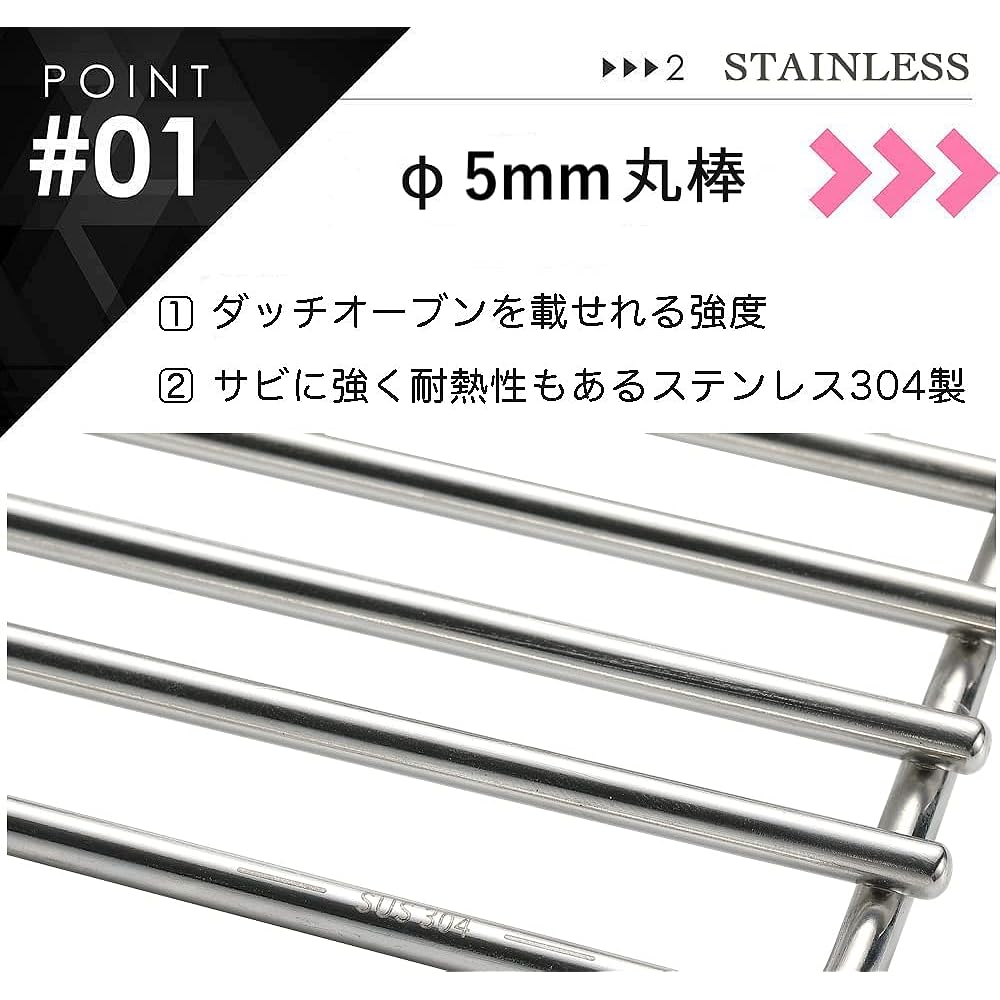 Material: φ5mm stainless steel 304 Size: Approx. 335 x 335mm (outer diameter φ5mm, rim diameter φ5mm) Weight: approx. 1.25kg Features: Rostle can be used not only as a barbecue grill, but also for Dutch oven cooking. It's an excellent product that covers all the types of cooking you need to do. Applications: Used as a stand for Uni◯Rem Fire Grill, Snow◯C Bonfire Stand M, etc., and for cooking in Dutch ovens. As a barbecue grill, the grilled color of the grill will whet your appetite.