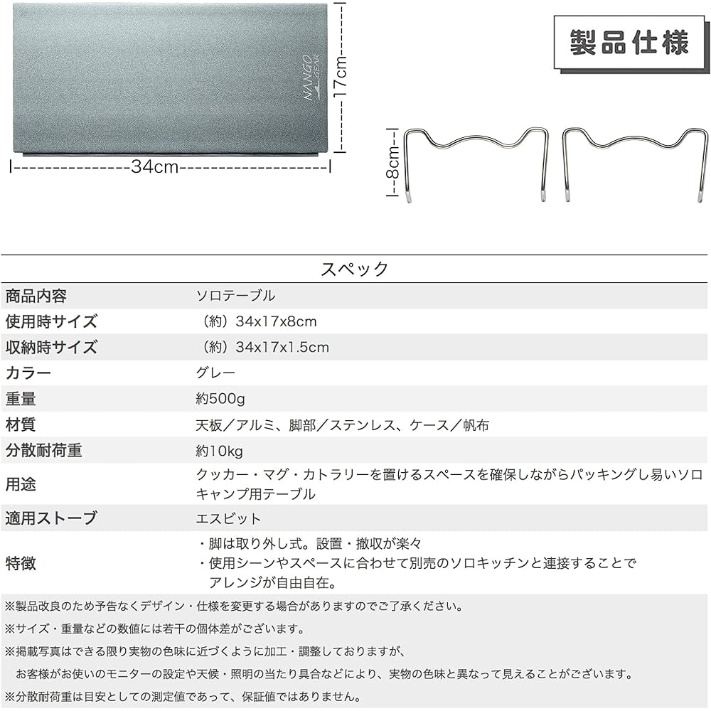 [Nanko Gear Aluminum Table] This table is a regular aluminum table with no grooves or cuts on the table surface. The size of the table surface is 34cm long x 17cm wide. It has a compact design so that it can be used not only for camping, but also for mountain climbing and touring. [ESBIT Pocket Stove Size] The aluminum table is designed according to the size of the SBIT pocket stove. As shown in the image, it is the perfect size to fit a pocket stove on the table. Pocket stoves are very compact. A compact pocket stove and a compact table make it a perfect match. [Lightweight with aluminum material] The table material is made of aluminum. The board thickness is 2.2mm, so the total weight including the legs is 530g. In addition, the load capacity is 30kg (we have confirmed this with the manufacturer many times), making this table both lightweight and strong. [Can be used regardless of the site] We paid special attention to the shape of the legs so that it can be used regardless of the site environment, such as grass, gravel, asphalt, etc., and it is designed to be firmly supported by 4 supporting points even on uneven sites. did. Set contents: Aluminum table x 1, storage bag x 1 / Material: A5052 (aluminum alloy)