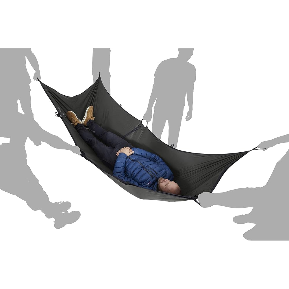 Material: 100% nylon, 68D, ripstop, hydrostatic pressure: 3000mm Size: 260cm x 220cm (Pack Size 15cm x 20cm x 8cm), Weight: 880g Function: Emergency stretcher with 9 handles, single person use A multi-purpose tarp that can be used as a hammock or poncho. Accessories: Includes 6 aluminum helmet slides 20mm Guy ropes, poles and pegs sold separately
