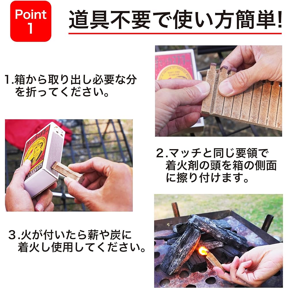 [🔥Match-type fire starter "Chucka Master (Fire Starter)"] Introducing the convenient match-type fire starter "Fire Starter" from PEAKS&TREES! [🔥 No tools required! Easy to start a fire] No tools such as matches, lighters, or burners required! You can light a fire by rubbing the fire starter inside the box against the box in the same way as a match ♪ This item is also recommended for camping beginners! [🔥Long Burning] Burns continuously for about 8 to 12 minutes. It can be used in a variety of situations such as bonfires, stoves, and cooking. [🔥Safe natural materials used] We use natural ingredients. This is an FSC certified product and a Rainforest Alliance certified product. Another good point is that it has low volatility and can be stored for a long time. [🔥Can be used in a variety of situations] Bonfires, campfires, wood stoves, fireplaces, barbecues, disaster prevention supplies, etc,. [Size] Width 6.5 x Height 12 x Thickness 3cm [Weight] 132g [Contents] 20 bottles (1 box) per) [Raw materials] Compressed wood fiber, vegetable wax [Country of origin] Sweden