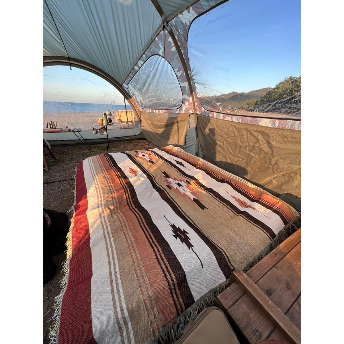 Just by placing a large Mexican rug on top of the cot, you can create a space that feels like an indigenous people's home. The flashy design of the Mexican rug matches the natural-colored tent and table.