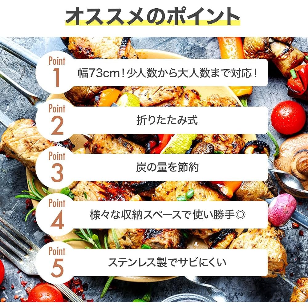This is a large barbecue stove that can be enjoyed by families and large groups while outdoors and camping. Although it is large, it is foldable, so it can be stored compactly, and it is lightweight and very convenient to carry! The grill is approximately 73cm wide, making it a large size that can accommodate both small and large groups. You can enjoy barbecue with this one device, so use it at parties, swimming at the beach, etc. and have a great time! The side of the stove also comes with a convenient alloy plate where you can place things, and a rack where you can hang tongs and store seasonings. There is a shelf at the bottom where you can store ingredients and small items, so you can store a lot of ingredients and cooking utensils. [Product details] Body size (approx.) W95.5 x D33.5 x H70cm (when assembled), Weight: (approx.) 4.8kg, Materials: Main body/stainless steel, Grill/iron chrome plating, Suitable number of people: 5 ~15 people [Set contents] Main unit, 2 grills, 2 insoles, handle for removing grill