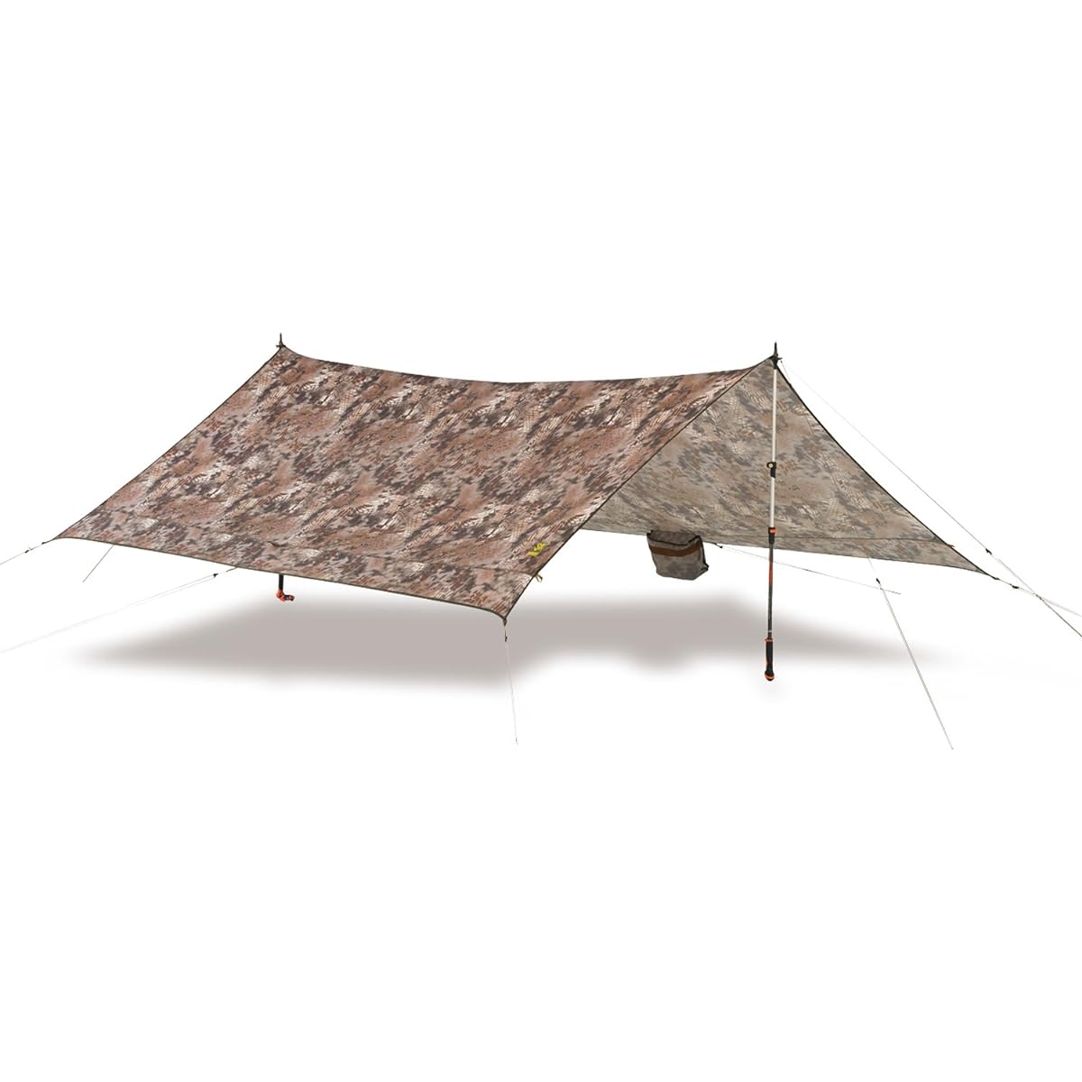 Easy to set up with trekking poles and P cords strung between trees. Lightweight, durable and compact, this satellite tarp can be strung in an almost unlimited variety of configurations. Ideal as a backcountry shelter for two or as a dining area or shade for four. The integrated pocket doubles as a pocket for key items and a carrying bag, and is sewn to prevent loss. We use Cryptech's camouflage pattern.