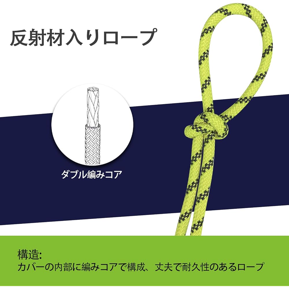 [Specifications] Thickness: Approx. 8mm Length: Approx. 40m; Material: Polyester; Load capacity: 2000kg [Features] The diameter of the high-strength rope is 8mm, and the load capacity is 2000kg. It won't break even if you pull up heavy loads. Reflective material: Since it is woven with reflective threads, it will reflect when you shine a light on it, increasing visibility in places where there is only a small amount of light.It is also highly visible at night, so it can be used as a tent or at a campsite at night. It also prevents you from tripping over the tarp rope and falling, making it easier to see and significantly improving safety. With a length of 40 meters, it can be used for various occasions. [Durability] The outer material is made of UV resistant, fading resistant, mildew resistant, and antiseptic material, and is highly durable, so it can be used many times during the leisure season. Can be used even in strong sunlight and heavy rain. It has the strength and durability to withstand strong winds. [Applications] This rope can be used for many purposes other than outdoor leisure activities such as tents, awnings, and camping. Suitable for installing tents, tarpaulins, hammock camping, etc. It can be used for a variety of outdoor activities such as camping, hanging clothes, hiking, etc. [Caution] This product cannot be used as a climbing rope to secure your body or to prevent a fall.