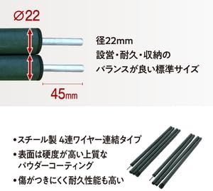 [Steel pole 2P set] Perfect for setting up a tarp! Set of 2 steel poles with high quality powder coating. ■Size: 240cm, ideal for setting up a tarp or campsite, with plenty of room ■Pole diameter: Standard size (22mm) with a good balance of construction, durability, and storage ■Wire type pole connection provides excellent stability and balance. The longer the pole, the more effective it becomes. ■The high-quality powder coating has a fine texture and smooth surface, and its high hardness makes it difficult to scratch and has excellent durability. ■Storage bag included