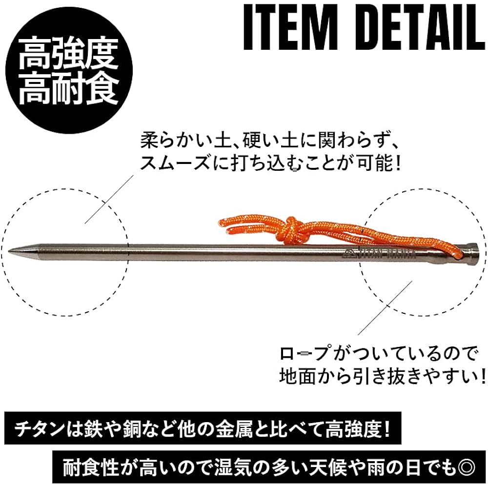 🔴 TITAN MANIA is a titanium product specialty brand from Osaka that delivers products centered on high-quality camping gear that camping and outdoor enthusiasts will love for years to come. ✅ [Product details] 5 x 165 mm Size (approx.): 165 mm Diameter (approx.): 5 mm Weight (approx.): 15 g Material: Titanium [Set contents] Main unit x 12, storage bag ✅ Essentials for camping! Light and sturdy titanium pegs. Basic shape makes it easy to use in various situations! Comes with a peg rope, making it easy to pull out and remove! The highly visible orange peg rope can also serve as a landmark and prevent you from tripping! ✅It is lightweight but has excellent strength, so it can be driven smoothly regardless of whether it is soft or hard soil! Titanium pegs are corrosion resistant and durable! Titanium doesn't rust easily, so you don't have to worry about it even in humid weather or on rainy days! ✅ Made of titanium, it has high penetration power and can be used for all purposes! It's extremely lightweight, so it's perfect for solo camping where you don't want to increase your luggage! Recommended not only for setting up tents, awnings, tarps, etc., but also for securing picnic sheets! The special storage bag allows you to carry it around and clean it up immediately after use! Even if you put it in your bag, it won't come into direct contact with other gear, so it won't get scratched!