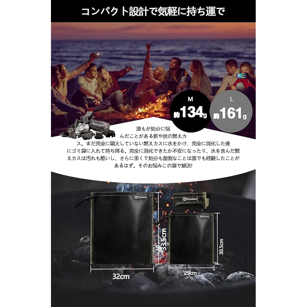 [Heat-resistant and waterproof material] The fire extinguisher bag is made of glass fiber + silica coat, which is a heat-resistant material. Filling the bag with used charcoal or wood residue that is still slightly hot and tightening the bag will create an oxygen-deficient condition inside the bag, which will encourage natural fire extinguishment and allow you to take the charcoal home safely and securely. A bag for burning debris. Moreover, it is waterproof and easy to clean by washing with water. [Perfect replacement for fire extinguisher] Great for camping sites where you can't throw away charcoal or burnt debris! Fire extinguisher bag: It's compact, so it's easy to store and you don't have to carry around a big fire extinguisher. 【Buckle Design】Put the used charcoal into the fire extinguisher bag, fold it and secure it, reduce the oxygen inside and promote natural extinguishing. Designed with rope. If the temperature is too high, it will burn easily, the rope will not be fixed, and charcoal sparks will fall. Therefore, the buckle is more efficient and faster. Prevents burns. Safer: Wear gloves if necessary to prevent overheating. [High airtightness] The string and sewing thread that tie the bag's opening are also made of heat-resistant material, making it resistant to heat. However, it is not a fire extinguishing pot, so please do not put any burning or still hot embers into it. In the worst case, it will be damaged. Please put in the remains of charcoal or firewood that has been extinguished. [Available in 2 sizes] We recommend size M (width 30cm) for solo camping and other situations where there is not much burnt residue, and size L (width 33cm) for camping with 2-3 people. *This product is currently applying for design rights.