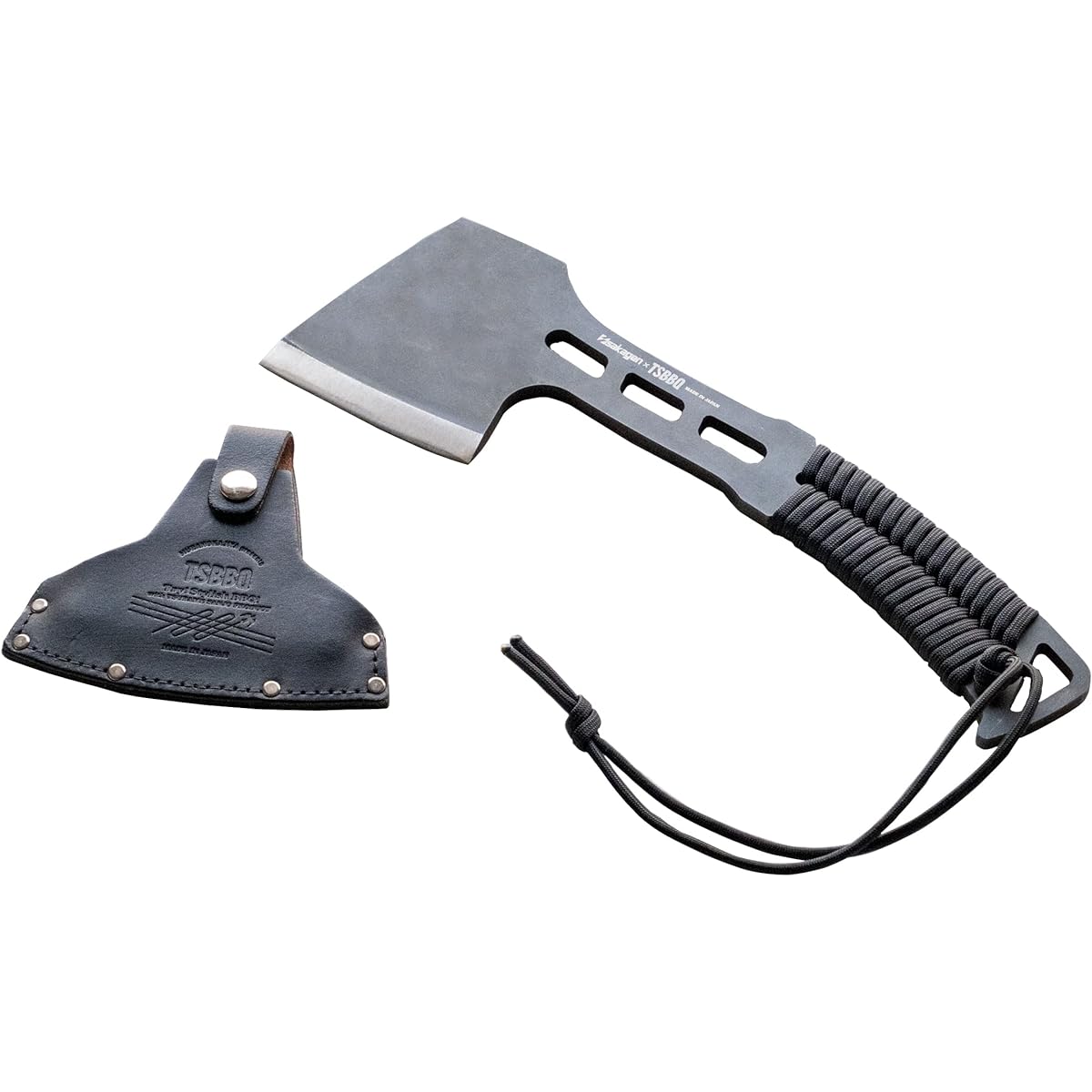 ■Precautions for use - Due to the characteristics of the material, this product is prone to rust. To prevent rust, please avoid handling by exposing it to water for a long time.・After use, remove moisture and dirt before storing.・The lines seen on the blade are unavoidable due to the manual process. Please note that this is not a scratch and there is no quality problem. -Due to the characteristics of the material, each item is finished by hand, so there may be slight scratch marks on the main body. please note that. [Product details] Materials: Main body cutlery rope (iron), cover leather Size: Width approx. 100mm (blade part) Total length approx. 298mm, Thickness approx. 6mm Weight: Body approx. 619g, Cover approx. 32g Manufacturer: Tsubame-Sanjo area, Niigata Prefecture Stylish TSBBQ, which proposes barbecue style, has released a new flat design "Skeleton Ax". Aiming for a slim shape that is easy to work with, easy to carry, and easy to store, we created a full-tang hatchet with an integrated blade and handle. You don't have to worry about the blade slipping or coming off even if you hit it hard while chopping wood. Full-tang axes, which are made from a single piece of metal up to the handle, tend to be heavy at just under 1kg, but the skeleton structure makes it surprisingly light at 619g. It is also possible to drive a peg into the head part. Due to its compact size, it can be used as a hatchet or as an alternative to a peg hammer. The paracord woven into the handle enhances the grip. He is also good at detailed work such as making feather sticks. Paracord can be added to the base of the blade or replaced. You can customize the grip and coloring to your liking.