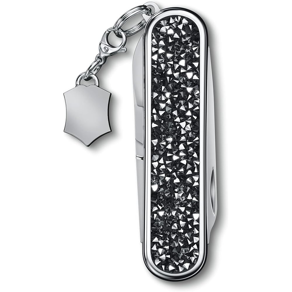 Number of functions: 5: Blade (Blade length: approx. 4cm) Nail file Flat head screwdriver Scissors Key ring Handle: Crystal Accessories: Certificate, charm Country of origin: Switzerland