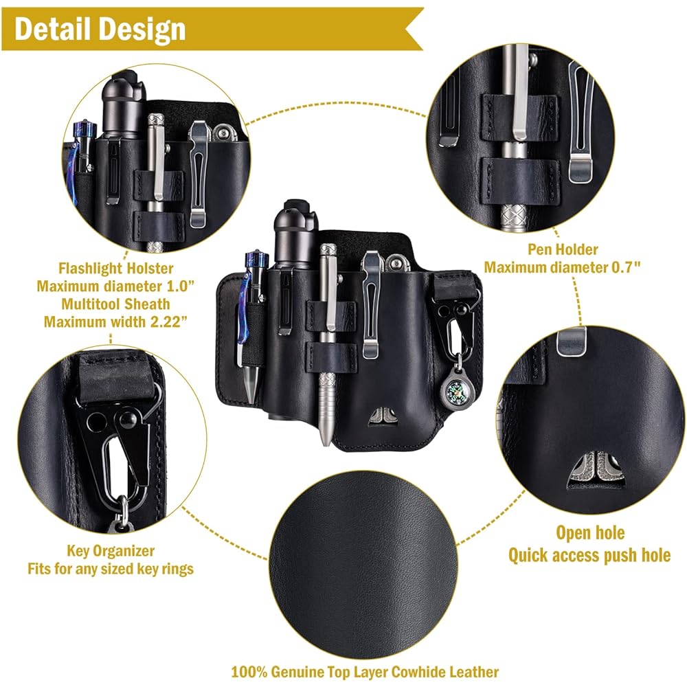 ⭐ [Multi-tool sheath] A practical and stylish leather multi-tool sheath for men. EDC belt sheath fits many tools like knives, tactical pens and flashlights. ⭐【Long-lasting】Handmade 100% genuine leather, durable and flexible, soft to the touch, the longer you use it, the brighter and newer the leather will look, and common scratches can be repaired. ⭐【Quick Access Design】The top opening and push-up hole design allows you to quickly access what you need for EDC. The push-up hole is small to prevent falling. EDC leather sheath fits your daily carrying tools, very convenient and safe. ⭐【Dimensions Multitool sheath size is 7.3 x 5.35, equipped with a belt loop and fits standard belts up to 1.7 inches. Comfortable to wear and convenient to use, it is ideal for everyday use and outdoor work. This leather multi-tool sheath is easy to carry, comfortable to wear, and suitable for outdoor and daily use. A very practical leather belt organizer, perfect gift for friends, family or yourself.
