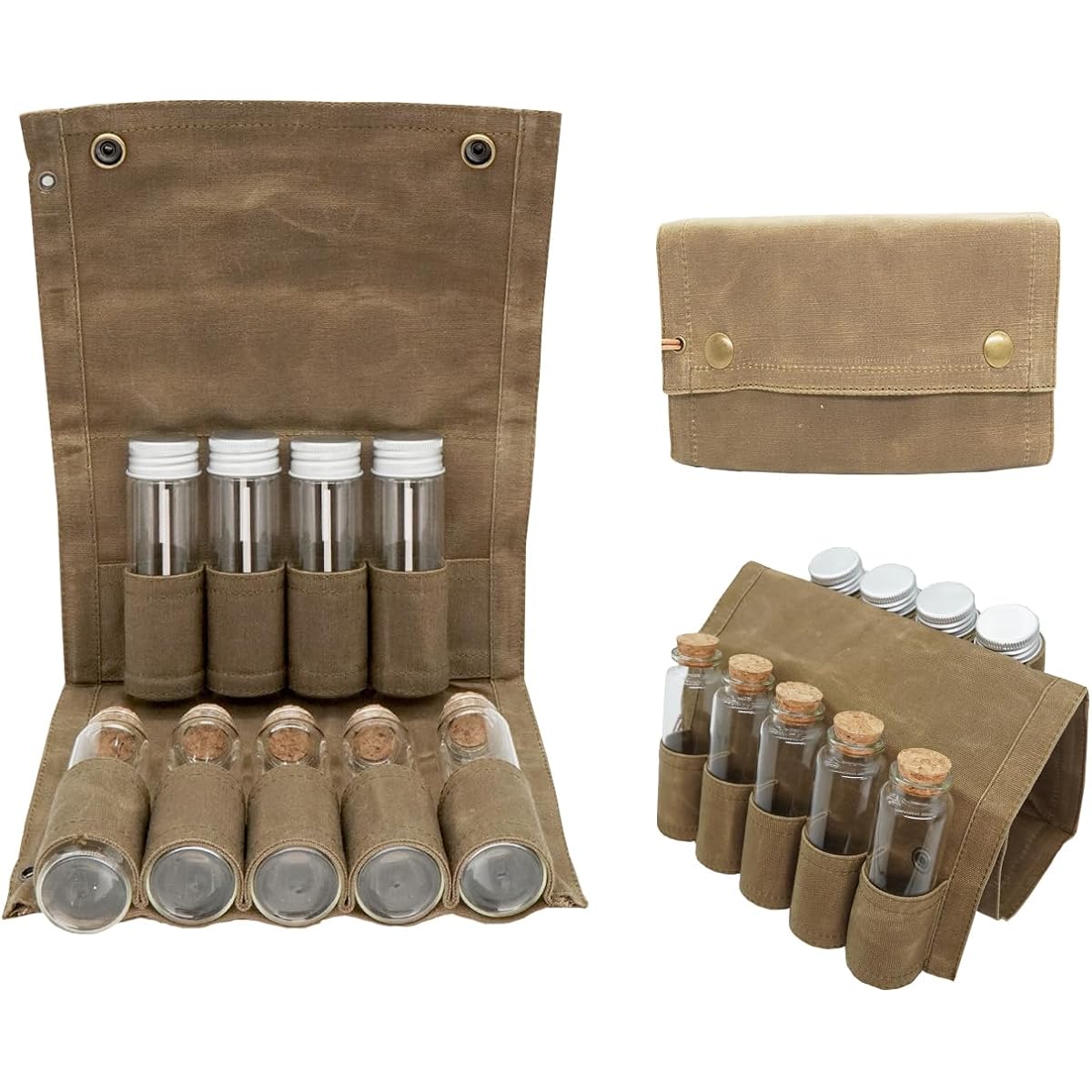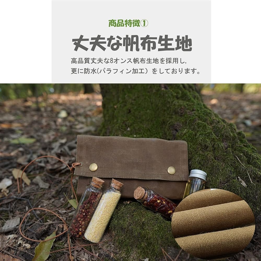 ① Compact size and easy to minimize seasoning set case ② Uses highly waterproof canvas fabric ③ Uses a hygienic glass container ④ Product specifications: Expanded size Length approx. 20cm Thickness approx. 5.5cm x Height approx. 10cm Weight : Approx. 380g ⑤Product material: Durable 100% cotton canvas (paraffin processed) Container: Glass (9 bottles) 1 bottle: Approx. 50ml *Outdoor tableware storage, spice box, seasoning container camping, camping seasoning container