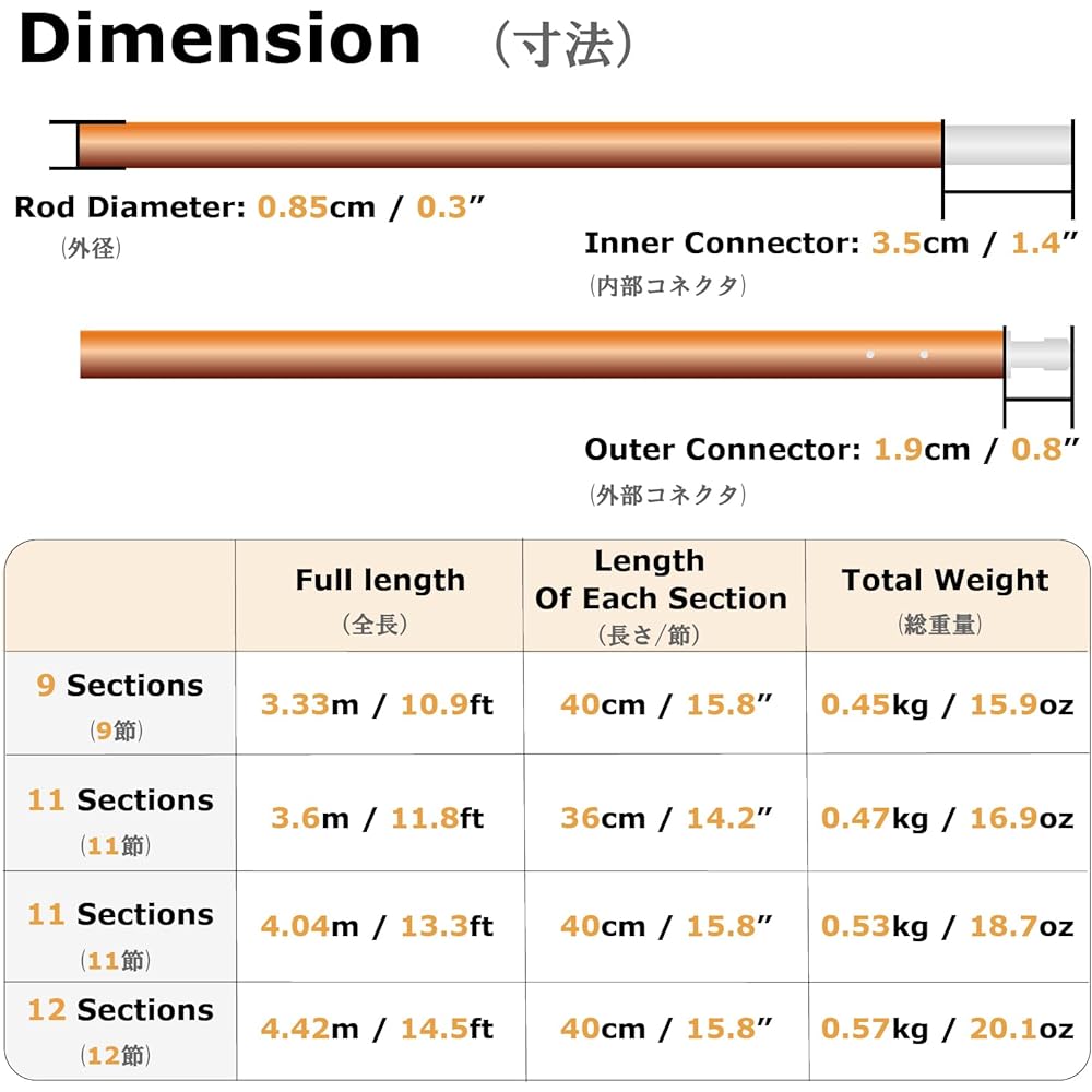 ✅ [Material] Made of aviation aluminum 7001T6 material, lightweight and easy to cut. The outer diameter of the pole is 8.5 mm, and the inner diameter (outer diameter of the joint part) is 7 mm. ✅ [Dimensions] The length shown is the length of the pole (gold part), not including the end. 3.33m: 9 sections, 4cm/section, weight 450g; 3.6m: 11 sections, 3.6cm/section, weight 470g ✅ [Dimensions] 4.04m: 11 sections, 4cm/section, weight 530g; 4.42m: 12 sections, 4cm /section, weight 570g. When replacing tent poles of different lengths, you can easily cut them to match the length. ✅ [Connection] The inside of the poles are connected with shock cords, making it easy to assemble and compact when stored. The joints are difficult to remove, so you don't have to worry about stability. ✅ [Convenient] The camping aluminum pole is a type that inserts a pin into the tip. It can be fixed by inserting the tip into the ring of the pin, making it ideal for touring tents and camping in the snow.