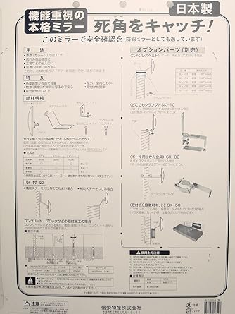 Country of Manufacture: Japan Materials: Mirror part/mirror glass, back plate resin (P.P), mounting bracket/iron (baked paint) Applications: Garage entrances, product management in stores, factory entrances, etc. It can be used for curved corners and other uses based on your ideas (new applications).Features: Angle adjustment is free, lightweight, objects (real images) are clearly reflected, so you can rest assured, effective field of view is wide, suitable for both outdoor and indoor use. Easy to install Part details: Mirror body (1 piece), main stay (1 piece), auxiliary stay (1 piece), mounting screws (4 pieces), concrete plug (4 pieces) Features of glass mirror (acrylic) (Compared to a mirror): There is no deterioration due to climate (temperature) changes, and the image is clear. Moreover, it is of high quality and lasts a long time, so it is economical.Note: Most of the current vehicle mirrors (car rearview mirrors) are made of glass.