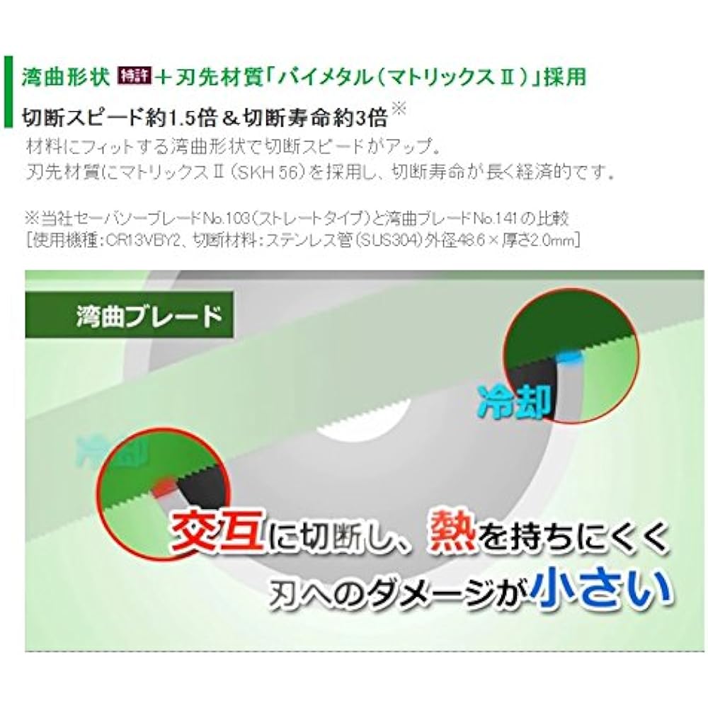 Curved + cutting edge material [Bimetal (Matrix II)] effect greatly increases work efficiency! Even more economical! Ideal for cutting and dismantling stainless steel! The curved shape (patented) fits the material and increases cutting speed. Cutting speed approximately 1.5 times * Cutting life approximately 3 times * * Comparison of our saber saw blade No. 103 (straight type) and curved blade No. 141 [Note] The effective length of the blade is 66 mm less than the total length. Cutting guideline (mm) Stainless steel material [pipe material]: Outer diameter 60 or less, thickness 2.0 or less Stainless steel material [plate]: Thickness 2.0 or less Mild steel material [pipe material]: Outer diameter 60 or less, thickness 2.5~6 Mild steel material [plate material] ]: 2.5~19 Aluminum, brass, copper: Thickness 5~20 Synthetic resin (PVC, etc.) [Pipe material]: Outer diameter 60 or less, thickness 2.2~15 Synthetic resin (PVC, etc.) [Plate material]: Thickness 10~ 60