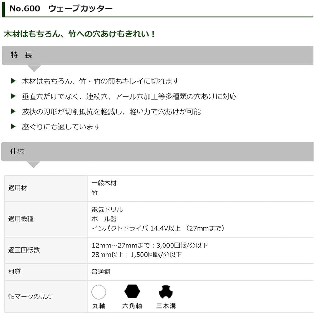 Suitable for counterboring and can drill holes neatly even with bamboo edges [Applications] Drill for drilling 51 mm holes in general wood and bamboo [Features] - Suitable for drilling holes in wood as well as bamboo - Through holes, diagonal holes, Capable of drilling holes such as stop holes, continuous holes, semicircular holes, round holes, etc. - Can be used with electric drills and drilling machines - The corrugated circular blade allows drilling of vertical holes, diagonal holes, and continuous double holes quickly with light force [ Notes: *Please use with power tools that operate at 1000 revolutions per minute or less. ●Perfect for drilling holes in wood and bamboo