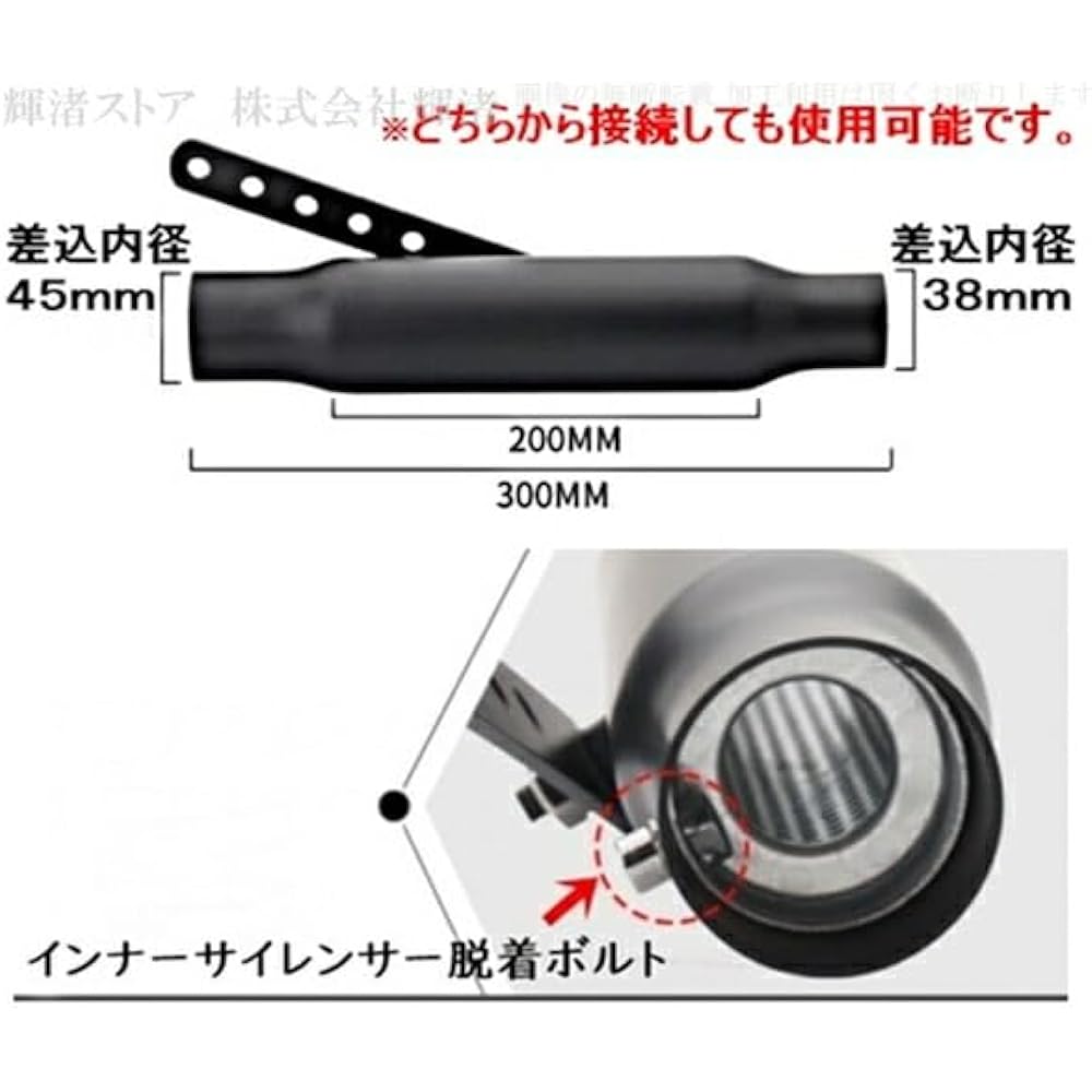 [Size] Total length 300mm Inner diameter of the connection part 45mm Inner diameter of the connection part 38-39mm (Can be used from either side / There is no split in the connection part) [Material/Contents] Slip 1 on muffler body: Iron (steel) Bolts, nuts, stays: Iron (steel) Product weight: 1190g (when weighing the main body + accessories at once) [Note] A removable inner silencer is built-in. [Please note the difficulty of installation as this is a general purpose product. ] Even if the diameter of the exhaust pipe matches, there are measures to prevent exhaust leakage (fine adjustment of the connection part), fixation to the car body (if it is insufficient, the worst case scenario is that it will fall off while driving), and sound deadening (for those who find it noisy). , inner baffle installation), etc., so we recommend that you ask a shop to make adjustments. Drag Star 400 Drag Star 250 W650 Drag Star SR400 Vulcan Vulcan 400 Vulcan 1500 Vulcan 900 Shadow 400 Shadow 750 Steed 400 Magna Magna 250 Virago 250 Intruder 400 Motorcycle muffler silencer parts long long exhaust pipe custom general-purpose motorcycle slip-on muffler slip-on muffler silencer American exhaust Pipes