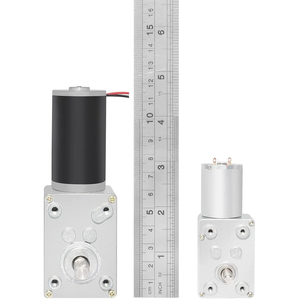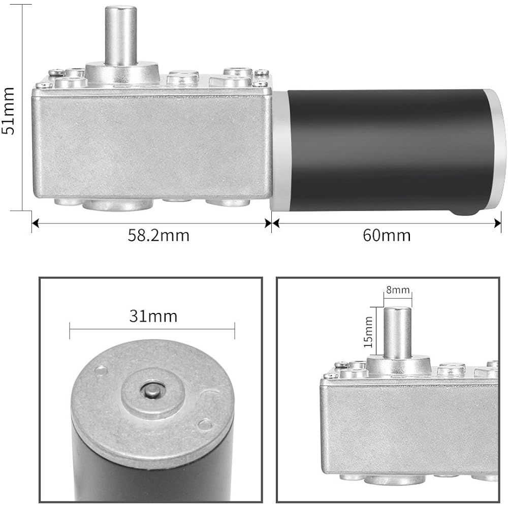 Ultra-high torque, specifications before ordering - Rated voltage: DC 12V; No-load speed: 0.6rpm; Rated torque: 30kg-cm rotation; Reduction ratio: 1/5300; Direction: CW/CCW. DC motor body dimensions: 31 x 57 mm / 1.22" x 2.24" (D * L); Gearbox dimensions: 58.1 x 40.1 " Output shaft dimensions: 8 x 15 mm/0.31" x 0.59" (D*L) and 1 x 13 mm/0.039*0.51 (H*L) flat cut/off; wire length: 19 mm/7.4" please. Extremely sturdy construction inside and out. The outer shell is well constructed and has optimal access to mounting screws. Very quiet and smooth operation, even under maximum load conditions, the carbon brush pad has a longer life. Function: The motor is a gear DC motor, micro-turbine self-lock and wiring-connection to change the motor rotation, TURBO worm gear motor, no electric motor, output shaft The motor shaft is fixed, self-locking; the motor shaft is aligned vertically with the reducer output shaft to achieve the entire motor output. Package List: 1pc x DC Gear Motor + 4pcs Mounting Screws; If you need other motors, please contact us, we have many other models available in our store.