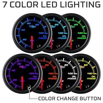 Overview GlowShift's Black 7 Color Series Oil Pressure Gauge displays from 0 to 100 PSI, allowing you to easily monitor your vehicle's oil pressure and keep bearings, crankshafts, and other critical engine parts properly lubricated. Masu. Gauge Features This oil pressure gauge features a 270 degree sweeping red needle driven by stepper motor technology. Gauge readings are very smooth and accurate. This gauge also features an easy-to-read magnifying lens and 7-color dial LED lighting to match your factory dash lights or add a custom look to your interior. Our 7 color through-dial LED lighting system allows users to easily switch between 7 single color modes, 2 color cycle modes. Also, when connected to the factory headlight switch, the LEDs can be dimmed by 30% for easier night driving. With the included color memory recall feature, you don't have to worry about adjusting the gauge color every time you turn on your car. This oil pressure gauge includes a 1/8 NPT electronic oil pressure sensor that allows you to accurately read your vehicle's oil pressure from 0-100PSI. You can purchase and install GlowShift's oil filter sandwich adapter or T-fitting. Lifetime Support At GlowShift, we stand behind all of our products. Includes free lifetime technical support and a 1-year limited warranty with every gauge purchase.