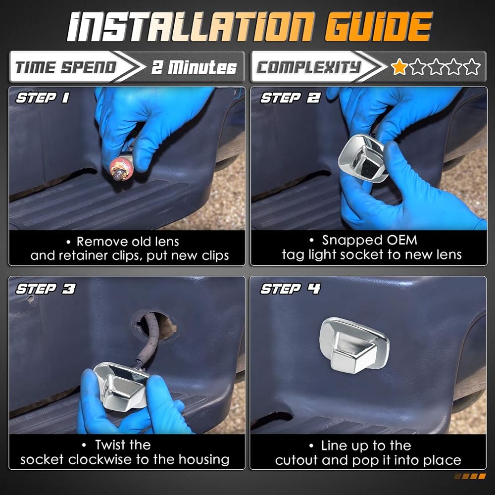 [Made in Taiwan:] Durable polycarbonate clips that will not break even after several repetitions during installation. Innovative 4 cutouts allow you to replace the 2 ears that fit securely into the license plate light wall. Fits like a glove. Smooth chrome finish cover lens instead of 10 year textured corrosion tag light housing. IP68 waterproof, anti-scratch, and won't fade even after long exposure. [Easy to install:] Plug and play, no tools required. Can be directly replaced with genuine lens 1ALHT0002. Replacing your license plate light lamp takes just a few minutes. It looks almost the same as the original lens. [Compatible models:] 1988-1999 Chevrolet GMC C1500 K1500, 1988-2000 Chevrolet GMC C2500 C3500 K2500 K3500, 1992-1999 Chevrolet GMC C1500 C1500 K1500 K2500 Suburban, 1985-1993 Chevrolet S10 Blazer, 1 987 ~1994 Chevrolet Blazer, 1995-2000 Chevrolet Tahoe, 1991 Chevrolet Tahoe, 1991 Chevrolet Blazer, 1991 Chevrolet Tahoe. - 2000 GMC C3500HD, 1992-2000 GMC Yukon, 1985-1990 GMC S15, 1991-1993 GMC Sonoma (all with step bumper) [Package Includes:] Save time and money. Upgrade your pickup truck's broken tag light housing with a rear step bumper. 2 license plate light chrome housings and 2 stainless steel retainer clips. Note: LED bulbs or sockets are not included. [1 Year Warranty:] From the date of your order, if you have any problems before or after your purchase, please feel free to email us. We will take photos of your case seriously regardless of the warranty period.