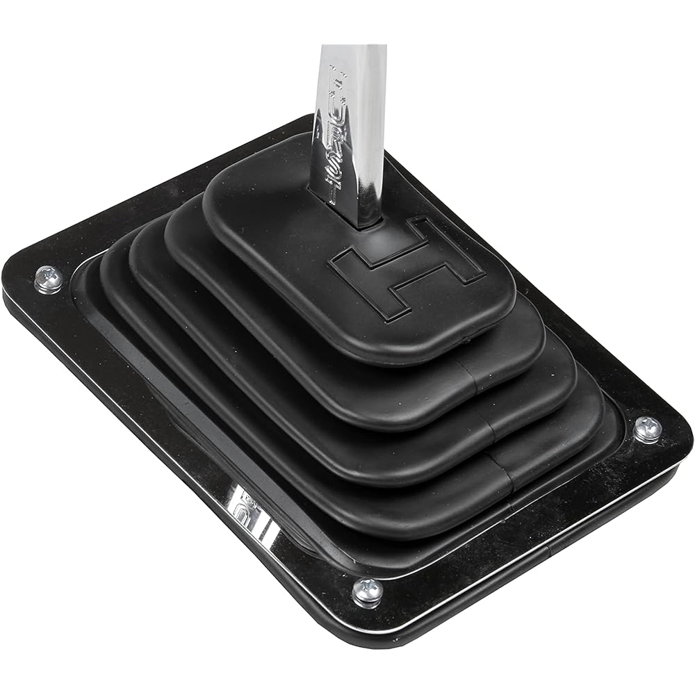 Our most popular boots are compatible with most shifter installations. Includes chrome trim plate and mounting hardware. Size: 5-1/4 inch. x 6-1/2"