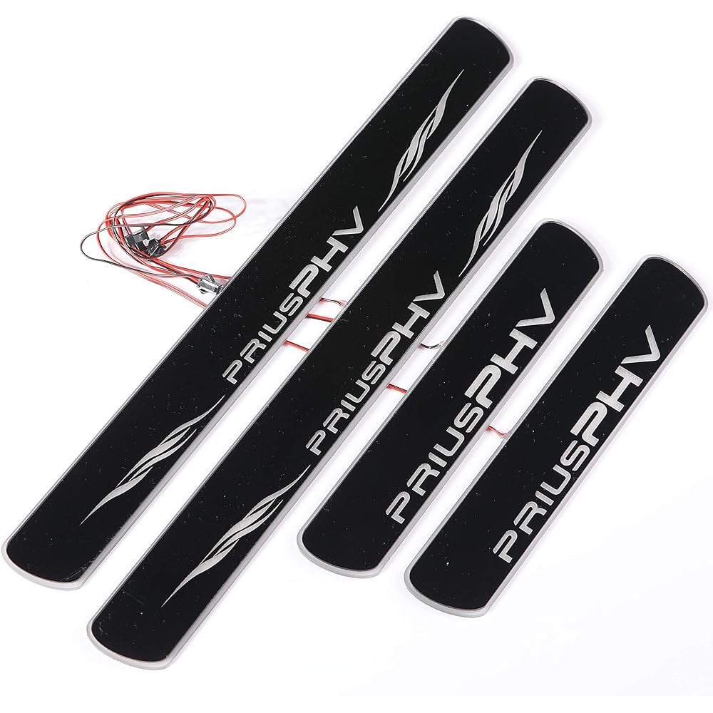 Toyota Prius PHV LED scuff plate with illumination function, black mirror surface, white LED, 4-piece set for front and rear seats Compatible models: Toyota Prius PHV ZVW52 Size: For front seat: 430mm x 47mm / For rear seat: 250mm x 47mm Installation instructions are Not included. The logo (PRIUS PHV) and the edge of the plate shine white on the luxurious black mirror surface. With illumination function. There are also blue LED types (CAR-SCP-PRIUSPHV-B) and white LED types (CAR-SCP-PRIUSPHV-W).