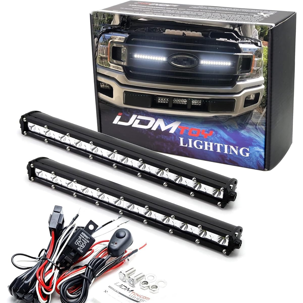 This page introduces a set of iJDMTOY front grille LED light bar kits compatible with 2018 and newer Ford F150 XL XLT. Includes two 36W slim high power LED light bars, front grille mounting bracket, and on/off switch wiring kit. To learn more about the product, please see the detailed feature bulletin and images.