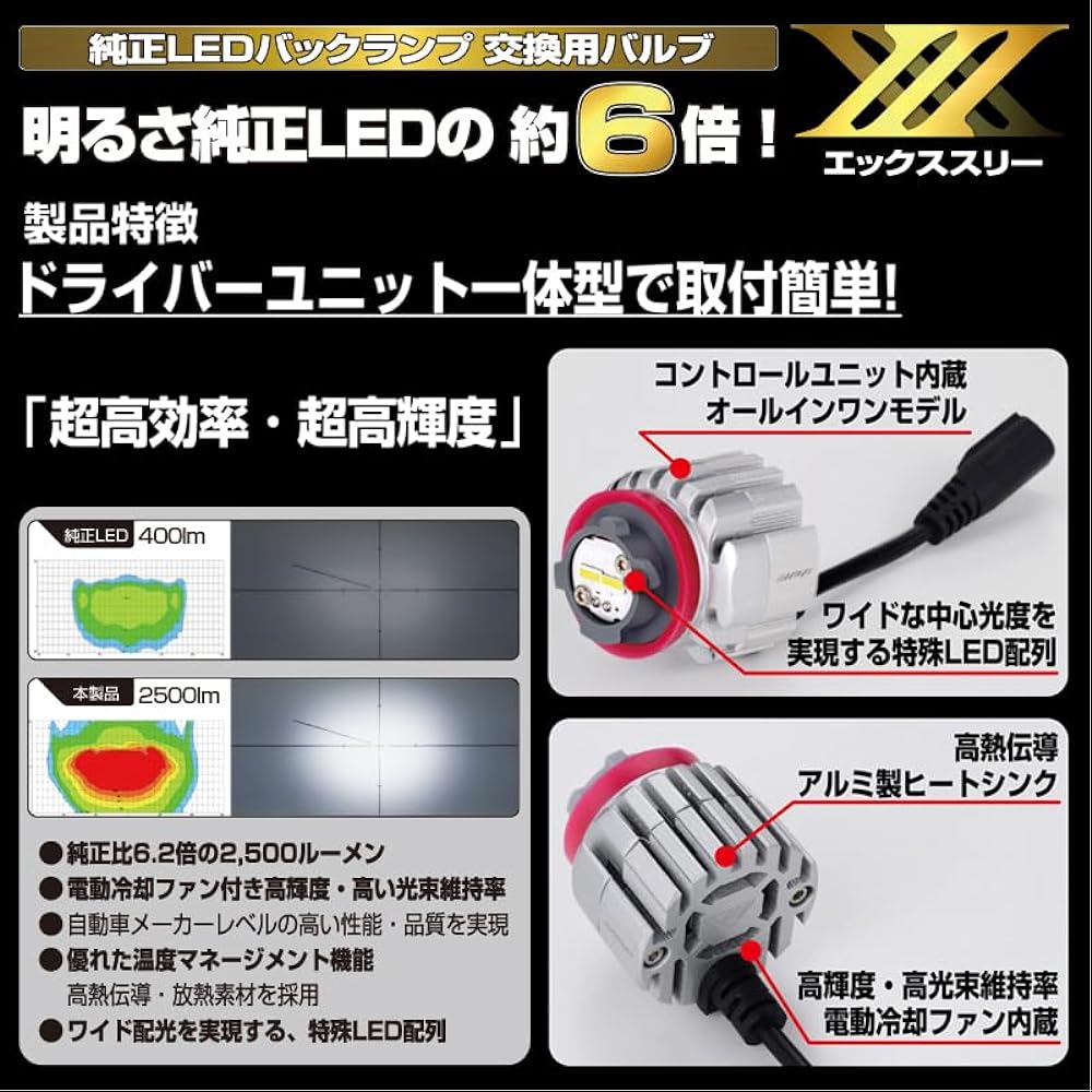 ●Finally, the genuine LED back lamp replacement bulb is now available.●Many people say that the genuine one is dark, so this product eliminates their dissatisfaction.●Upgrades the genuine LED back lamp.●Illuminates the irradiation range with approximately 6.2 times the brightness of the genuine bulb, It appeals to following vehicles and improves safety ● Compatible with both bulb shapes LW5A and LW5B ● All-in-one model with built-in control unit for easy installation ● Comes with an electric cooling fan that achieves excellent luminous flux maintenance rate ● Temperature management function and high heat conduction・Uses heat-dissipating materials ●We carefully select highly durable and high-quality parts and manufacture them under thorough quality control.As a genuine parts supplier, we conduct tests in accordance with the standards required by car manufacturers, and our product performance Based on the evaluation data, we have set our own new harsh evaluation items such as salt mud water tests and actual vehicle durability tests, and have the durability to reproduce and withstand any conceivable usage environment in the world ●Hybrid Compatible with , EV, PHEV, LPG, CNG vehicles ● Compatible with vehicle inspection ● 3 year warranty * For domestic 12V vehicles only * This product is a replacement bulb for genuine LED back lamps * Please check our website for compatibility information * Special specifications Compatibility information may differ depending on the vehicle, optional vehicle, grade, etc., so please check the actual vehicle. *Depending on the vehicle, it may be necessary to remove the light body (bumper). *This product does not comply with safety standards. This is a vehicle inspection compatible product that emits light within the chromaticity range specified by JIS D5500, but because the emitted light color is different from the genuine bulb, it may be deemed non-compliant for vehicle inspection. In that case, please return to the genuine bulb. *Commercial vehicles such as taxis are not covered by the warranty. *Using this product may cause the out-of-bulb warning light to turn on or blinking in some vehicles. *Using this product This may cause noise to enter radios, etc. *Since the vehicle equipment below is designed to be used in combination with the genuine valve, there is a risk that it may not function properly if this product is installed. [Autonomous driving, collision damage mitigation braking (automatic braking), adaptive cruise control, lane departure prevention support system, false start prevention control function, clearance sonar, parking support system, adaptive headlamp, etc., camera, millimeter wave radar, infrared laser , devices using ultrasonic waves, etc.]*When connecting a connector, be sure to insert it firmly all the way. Please note that if the connector is not inserted properly, it may melt and cause a fire