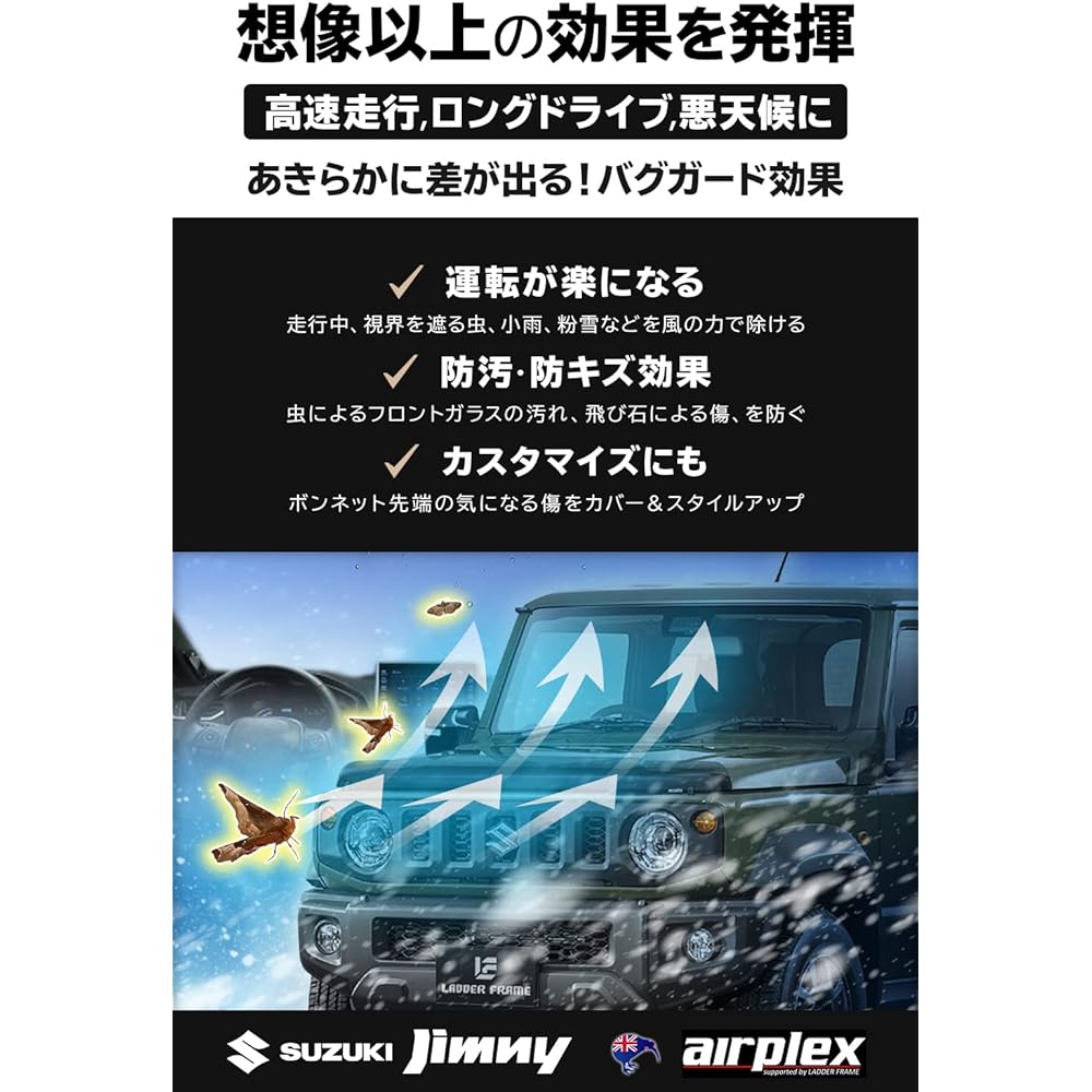 ✅ [Compatible models] SUZUKI Jimny JB64W / Sierra JB74W Current after July 2018 ✅ [Bug guard for Jimny] The main body part is very thick and well made. The edges of the protector are angled, so the wind flow changes considerably and you can really feel the effect. Japanese installation manual is included. ✅ [Insect repellent effect due to the power of the wind] It keeps bugs away from the windshield while driving at high speed, and it makes a noticeable difference in how dirty it gets when driving for a long time! Because it has a rectifying effect, it is effective even in light rain and powder snow. Can also be used to hide scratches on the tip of the bonnet caused by flying stones. ✅ [Made of high-quality acrylic material] Uses high-strength acrylic with excellent impact resistance, which is also used by major automobile manufacturers such as TOYOTA, Mitsubishi, and HONDA. . ✅ [Made in New Zealand with a history] Airplex is a manufacturer of automotive accessory parts that exports from New Zealand to all over the world and boasts a history of nearly 40 years, also manufacturing genuine local parts.