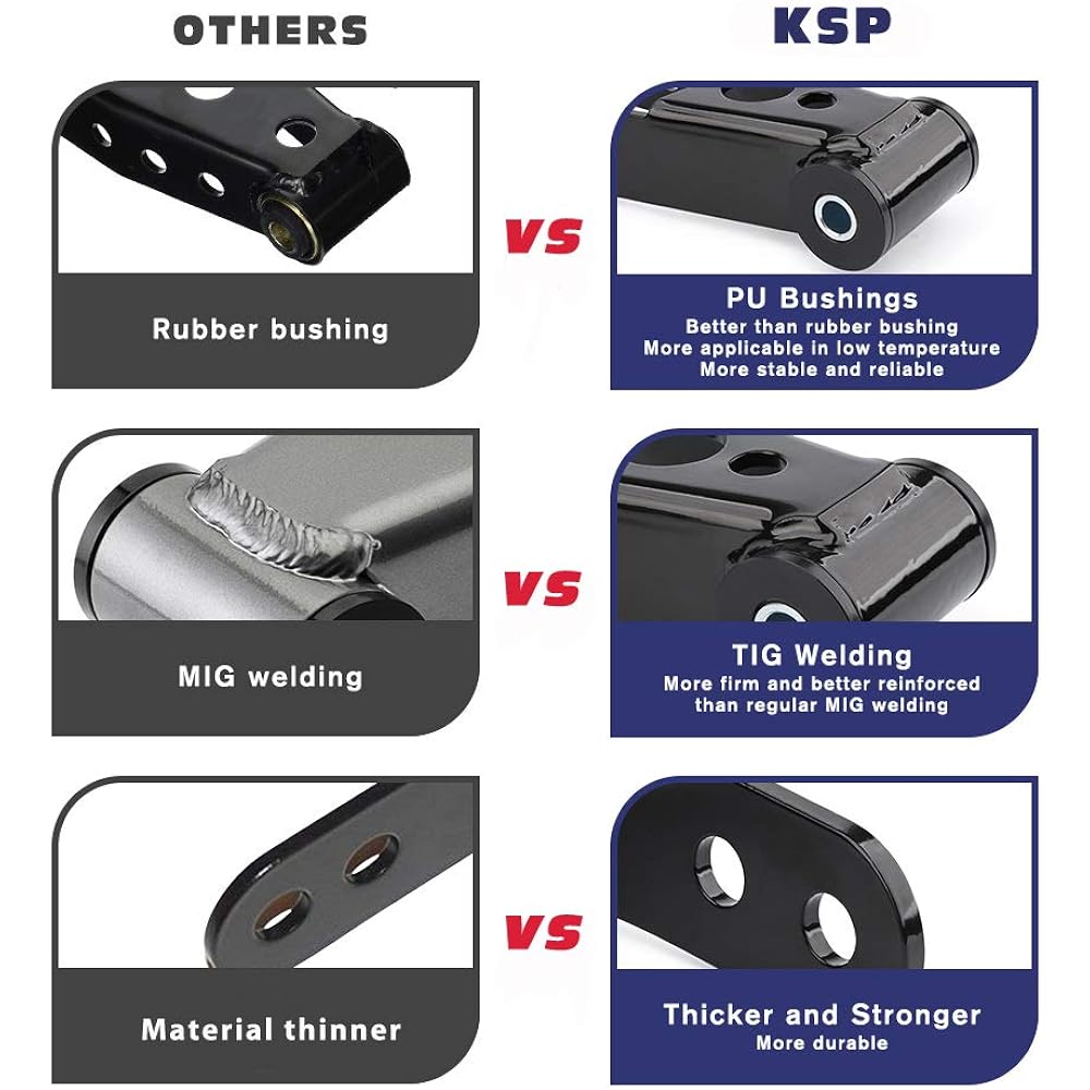 The KSP Rear Rolling Shackle Kit is a great option for eliminating nose-down rakes. Drops your truck 1" - 2" to the rear, improving handling and leveling up at the same time. The kit is thicker and more durable than OEM shackles. All of our kits are treated with powder coating to give a great finish and prevent corrosion from the kit. Adjustable drop shackles allow you to lower the truck 1" or 2" depending on the bolt hole you attach it to. Improtant Note: Depending on the year of your Silverdo 1500, the lowering kit will be installed in different directions. Before installing the shackle, install the grease fitting and apply grease to prevent it from making noise. We recommend always aligning your vehicle after changing its height.