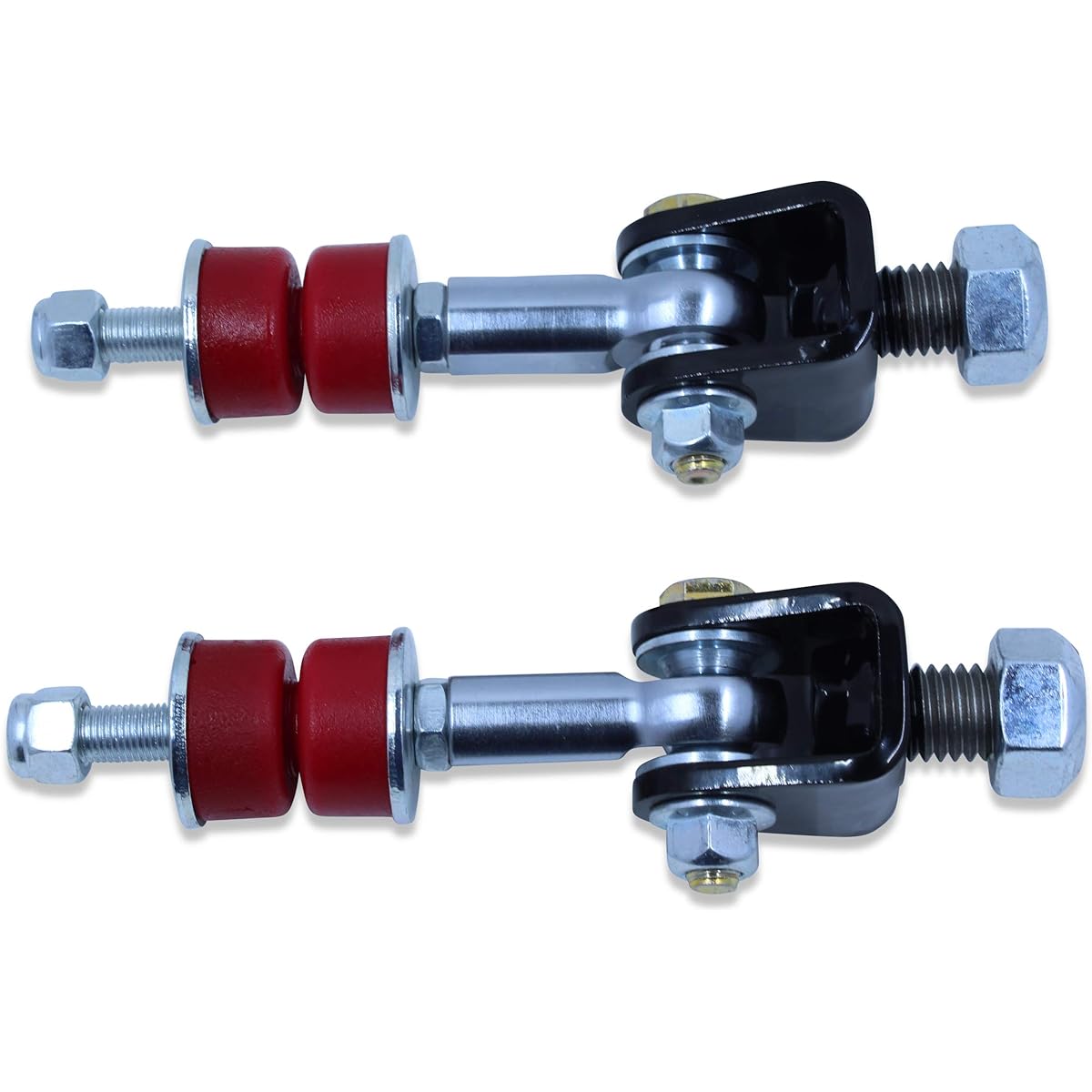 These spherical sway bar end links connect with chrome-plated, self-lubricating Teflon-lined chrome-moly spherical joints. Binding-free connection for maximum handling performance. It doesn't matter if you're running factory sway bars or larger aftermarket sway bars. Our spherical sway bar end links maximize your sway bar. The amount of stress applied to the sway bar end links is severe and requires a flex or non-binding end link to get the maximum handling performance you are looking for. Bolts onto the included CNC laser cut and the 3/16" steel clevis is made using basic hand tools. The clevis has a gloss black powder coated finish and includes all necessary mounting hardware for bolted installation. The other end of our spherical sway bar end link connects to the sway bar with a low deflection polyurethane bushing. Silver galvanized high strength 4140 chrome moly thread studs connect everything together. Price per pair - Quantity. 1 = 1 pair.