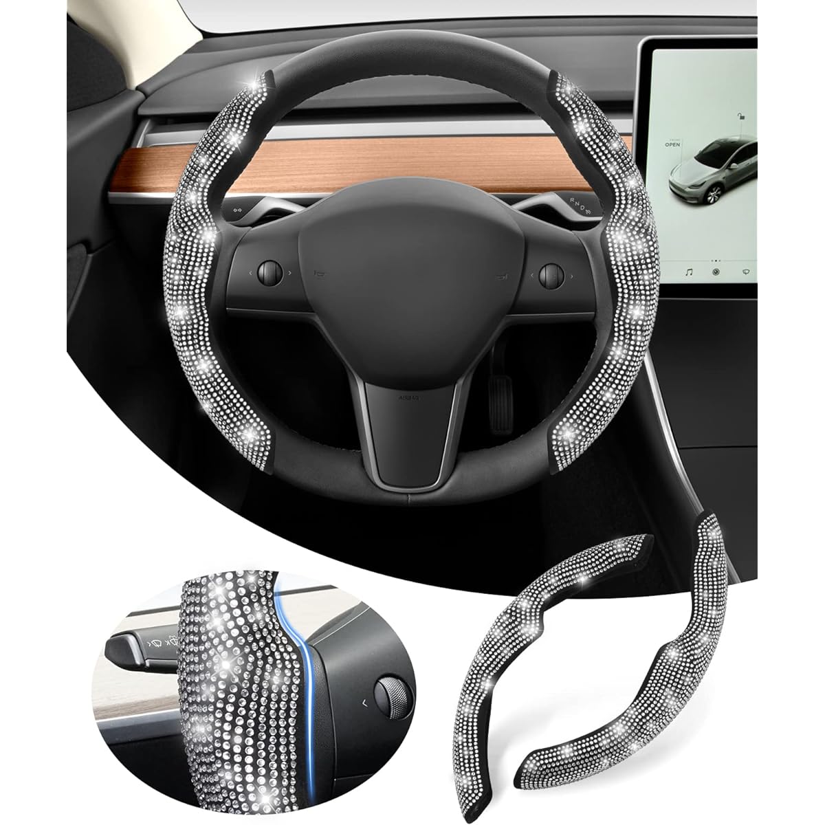 【Customized Tesla Accessories】Sunsdrew steering wheel cover perfectly fits Tesla Model Y 2020-2023/Model 3 2017-2023. Sunsdrew glitter car steering wheel cover is a glitter decoration for your car, perfect for birthday, Christmas and other occasions. 【2023 Upgraded Style】Made of soft velvet and top line drill craftsmanship. Each rhinestone is tightly adhered to the above, not easy to fall off, not hurt your hands, and has a very comfortable touch. Breathable, odorless, non-slip, no slipping or damage to the original car after installation. 【Good Grip & Comfort】The inner ring is non-slip and durable. The latest curved design wraps tightly around the handle. Help drivers improve road safety and reduce hidden troubles. Four Seasons Universal Steering Wheel Cover. Shining rhinestones on the surface massage your palm and keep you at the limit of fatigue driving and excessive speed. 【Fashion Diamond Design】The steering wheel cover is composed of hundreds of shiny rhinestones. The diamond steering wheel protector sparkles in the light and sparkles on your windshield, giving your car a pop of color and sparkling interior. The glittering diamond steering wheel cover is the perfect accessory for your Tesla's interior. 【Easy to install】Embedded design. Please use anti-slip stickers before installation. It only takes about 3 minutes to ensure a secure fit on the handle cover. The car becomes more shiny and delicate.