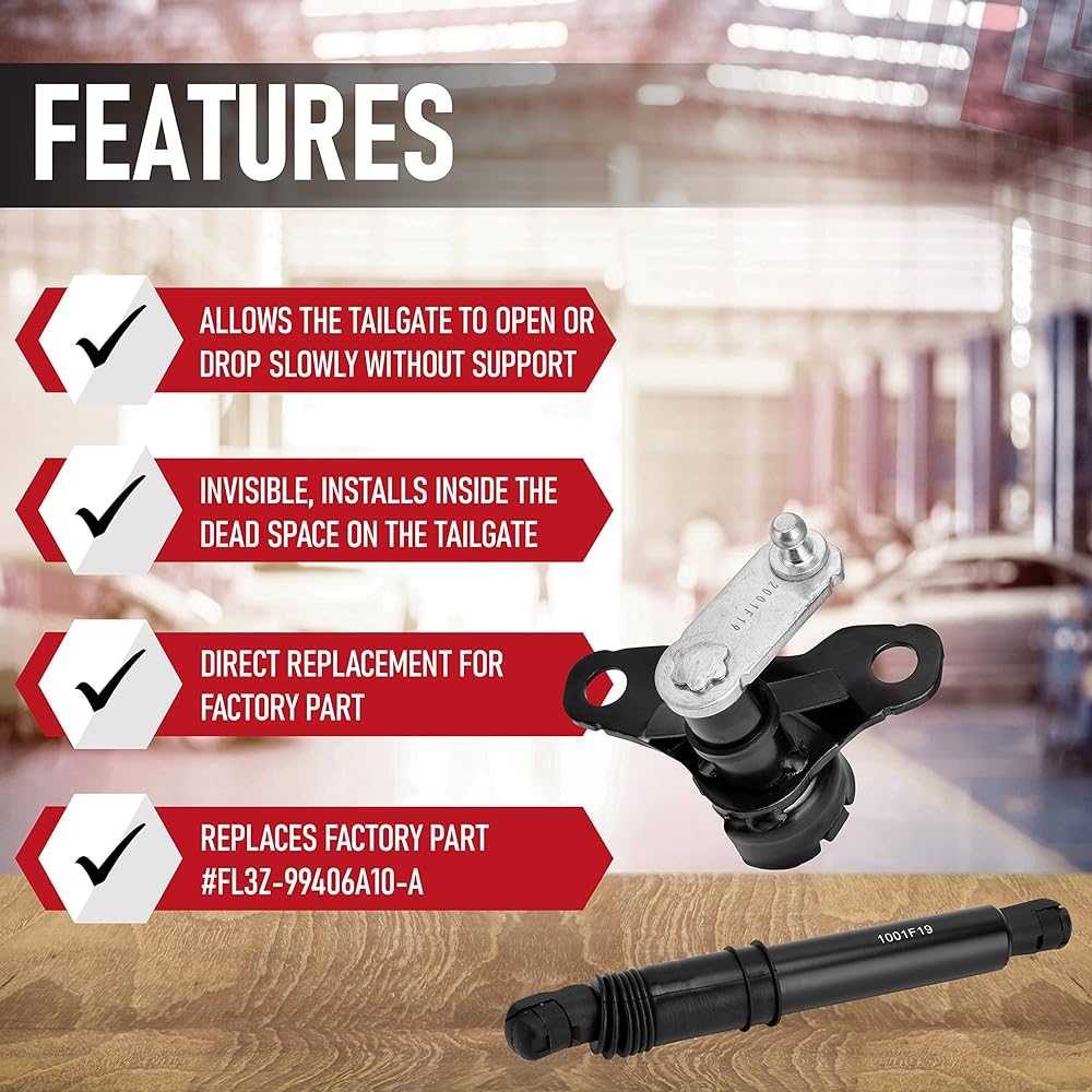 Replacement for Ford Tailgate Damper Accessory Kit. Aluminum tailgates are especially heavy, especially if you install accessories such as a tailgate step, which can cause the tailgate to fall out of your hand when opened. This kit lowers the tailgate slowly, controlled and safely. Having tailgate assist when opening is great. Some Ford F-150s came with it as a factory option. Most were not. This kit installs seamlessly behind your taillight. This tailgate damper kit installs easily on the passenger side and requires the removal of two T50 bolts to remove and replace the roller. The damper shock or strut attaches behind the passenger taillight, with the angled portion of the damper shock snapping from the bed to the mount and the straight portion attaching to the new rollers that come with the kit. Before removing the tailgate, make sure the tailgate harness, which is directly above the spare tire, is removed, it is heavy when removing the tailgate, and care must be taken when removing the tailgate. Fits: 2015 Ford F-150 2016 Ford F-150. 2017 Ford F-150 2018 Ford F-150 2019 Ford F-150 Replacement Part Number: FL3Z-99406A10-A, FL3Z99406A10A. This is a compatible replacement part manufactured by AA Ignition. This tailgate damper kit is not a genuine Ford or Motorcraft part. Ford and its associated vehicle models and part numbers are used only to identify the vehicles that the tailgate damper kits used in this listing will fit.