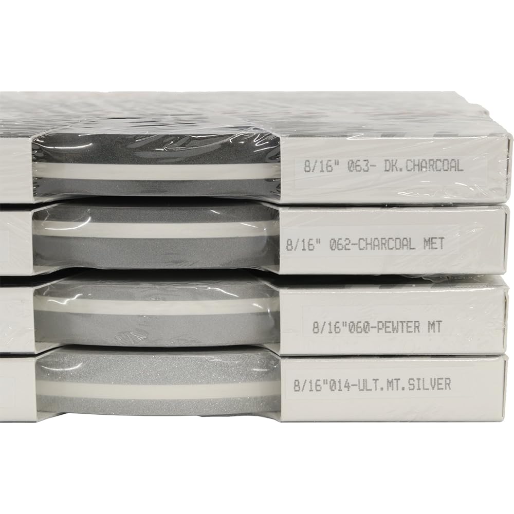 150 feet of uninterrupted roll. 2 mil premium high performance vinyl, 8 year durability. The two rows of narrow stripes have an overall width of 8/16 inches. One he has a 1/8" stripe, a 1/16" gap, and another 1/16" stripe (*note - the gap is not white, it's just a gap). Choose from 14 colors.
