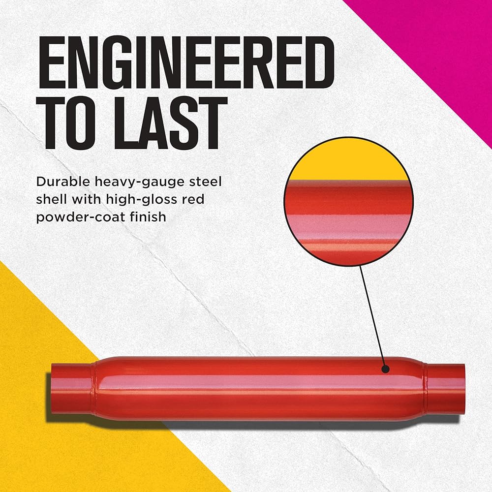 Vintage Sound - Provides powerful tones perfect for muscle cars, trucks, and classic cars. Premium Acoustic Control - Proprietary Continuous Roving Fiberglass (CRF) technology absorbs unwanted internal resonances. BUILT TO LAST - Durable heavy gauge steel shell with high gloss red powder coat finish. Superior Performance - Straight-through design for maximum flow and power. FLEXIBLE SOLUTION - Customizable designs come in a variety of styles and sizes for a universal fit (special manufacturing or welding may be required). Specifications -- 3.5 inch available. or 4 inches. Body; available in various overall length and inlet/outlet size configurations; see product specifications for details.